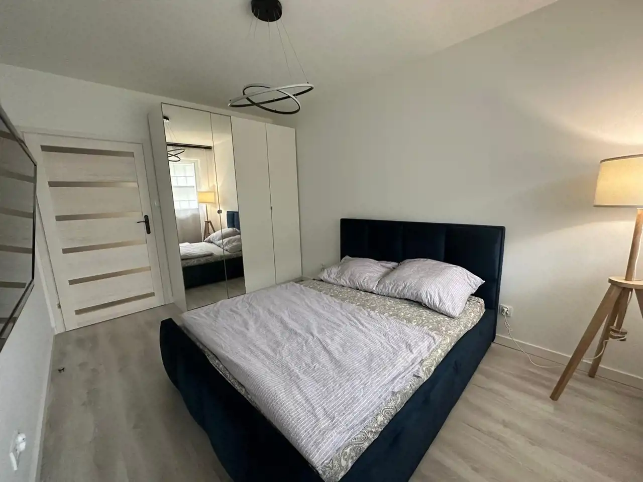 • Sypialnia (12,4 m²) – łóżko małżeńskie, pojemna szafa
