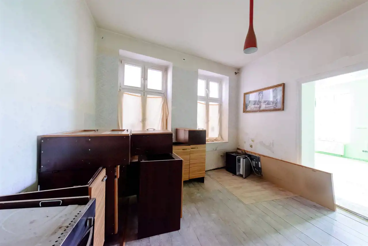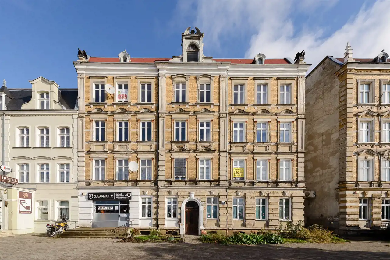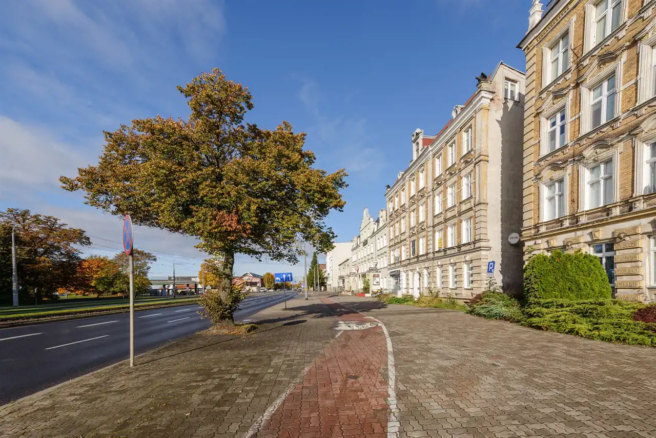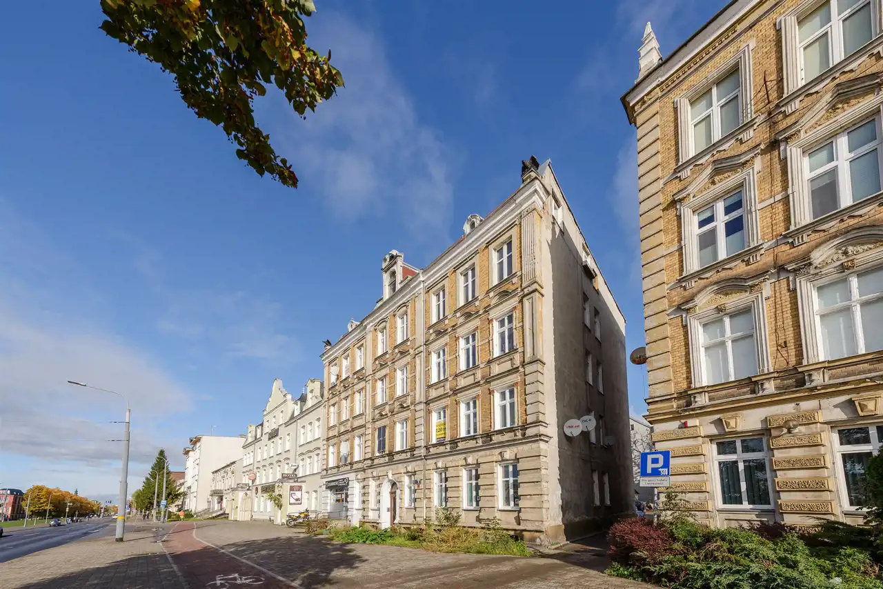 Przy jednej z głównych, a na pewno najbardziej charakterystycznych dla elblążan ulicy, znajduje się stylowa kamienica, w której na parterze od strony głównej ulicy i chodnika, znajduje się opisywana nieruchomość. Przed laty, składała się z dwóch osobnych mieszkań, stąd możliwość podziału i przywrócenia dawnego rozkładu. Kolejną możliwością jest, przeznaczenie jej, pod działalność której sprzyja reprezentacyjne położenie. Mieszkanie o powierzchni ok 77 m² składa się z trzech pomieszczeń, dużego korytarza, oraz łazienki i kuchni. Wstępnie zaczęto przygotowania pod kancelarię by wykorzystać potencjał lokalizacji, ale koncepcja została zmieniona na rzecz sprzedaży. Do mieszkania przynależy duża piwnica oraz strych.