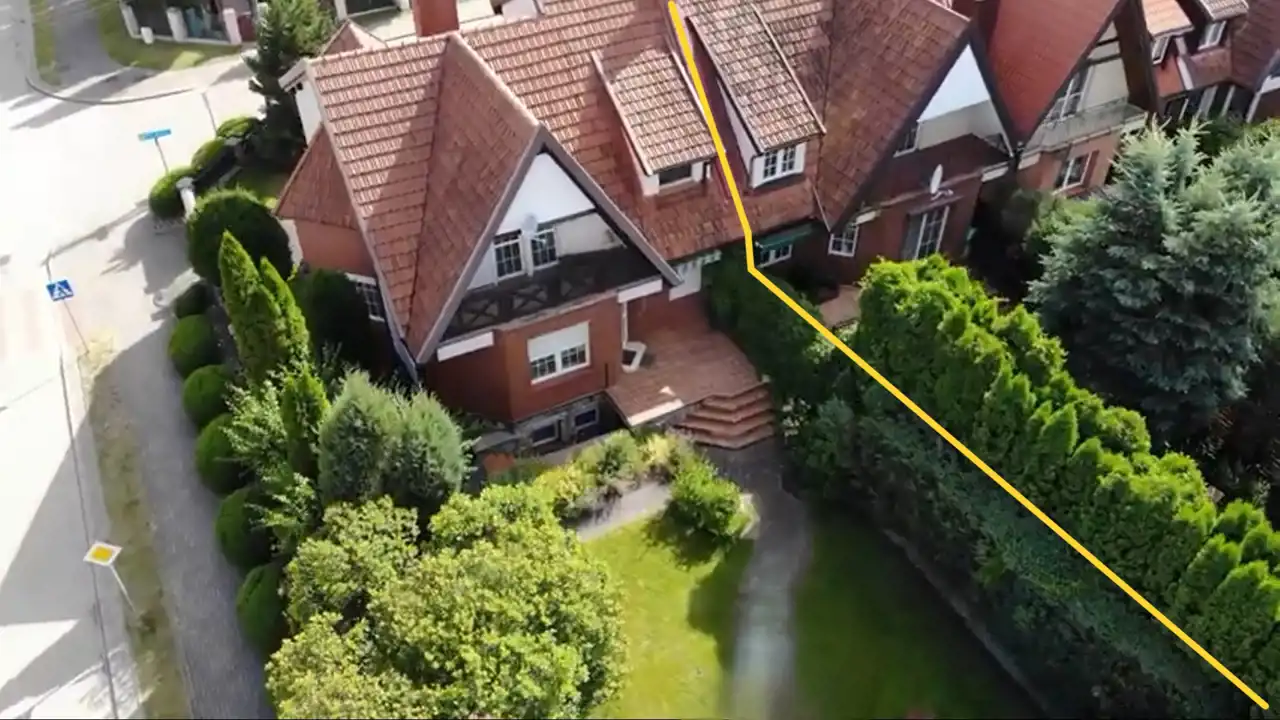 Dom połączony bokiem z inną nieruchomością zachowuje podobną elewację, jednak wyróżnia się odmienną fasadą i zabudową, co czyni go niepowtarzalnym.