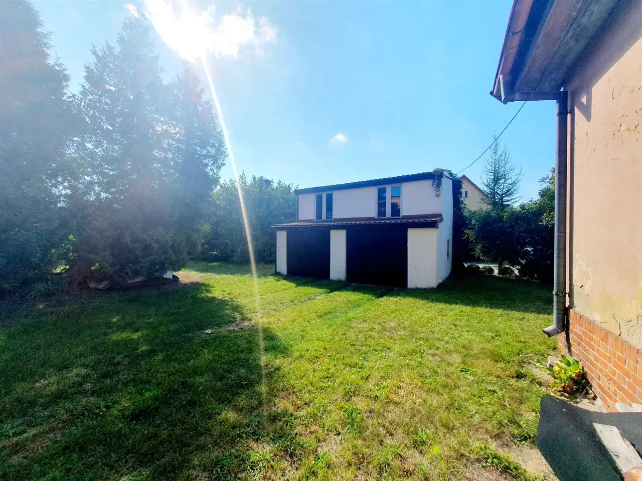 Na posesji znajduje się także duży budynek gospodarczy, w którym mieszczą się dwa garaże oraz użytkowe poddasze. To idealne miejsce na warsztat, magazyn lub przestrzeń do przechowywania. Dach budynku gospodarczego pokryty jest blachodachówką.