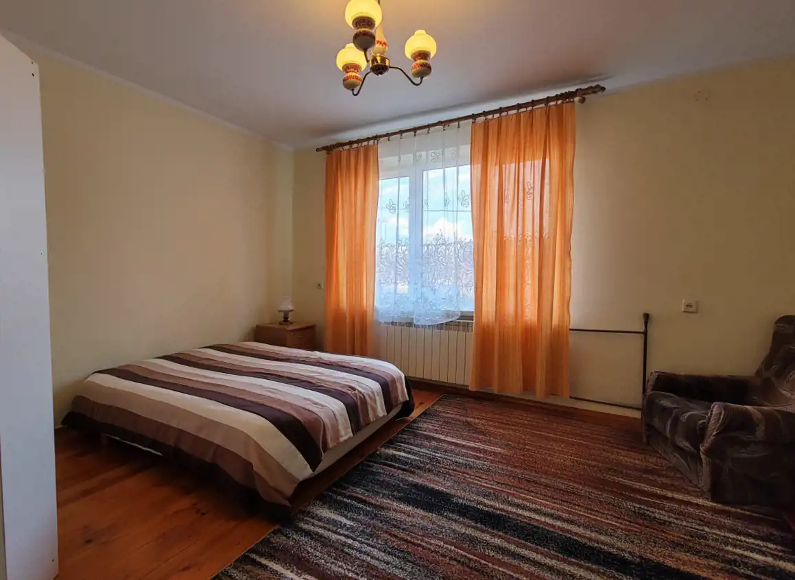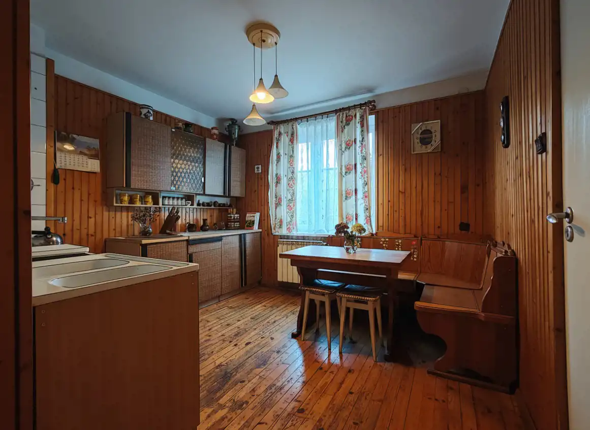 Dom został zaprojektowany z myślą o komforcie i funkcjonalności w latach siedemdziesiątych. Na parterze znajduje się salon, sypialnia, kuchnia ze spiżarnią oraz łazienka z prysznicem i wc. Na piętrze mamy 3 sypialnie oraz łazienkę z wanną i wc. Od czasów budowy sukcesywnie podnoszono standard nieruchomości poprzez docieplenie, wstawienie pieca gazowego i odświeżenie pokoi.