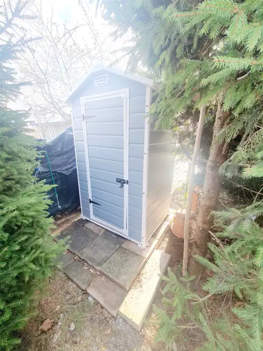 Oddzielne pomieszczenie z koszem na śmieci i toaletą turystyczną.