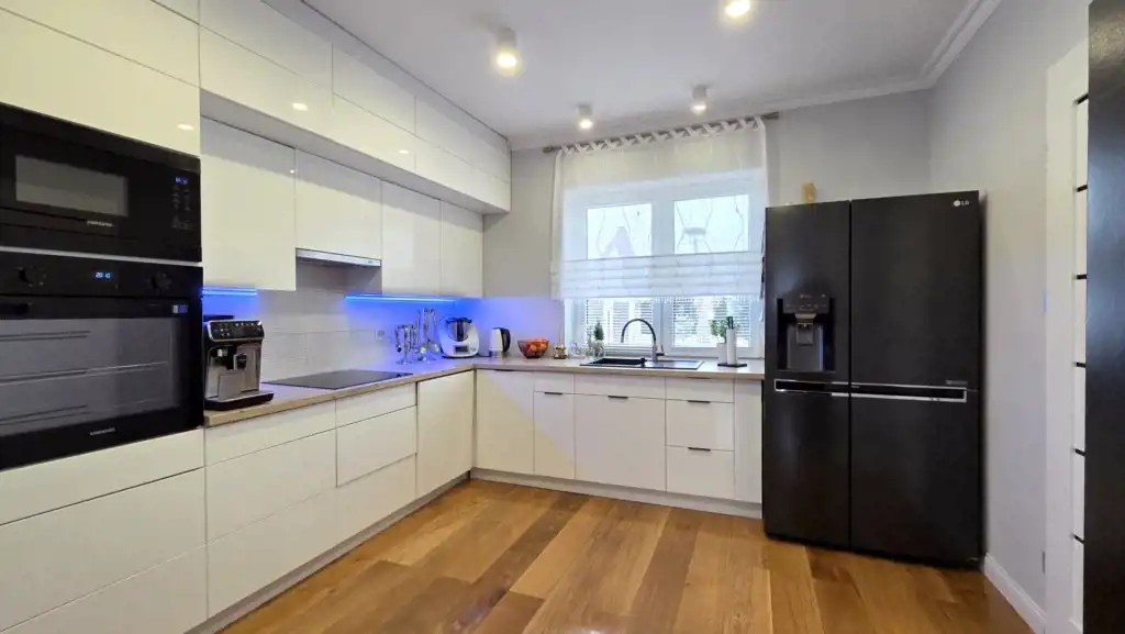kuchnia w zabudowie z pełnym AGD: piekarnik, płyta indukcyjna, zmywarka, lodówka, okap