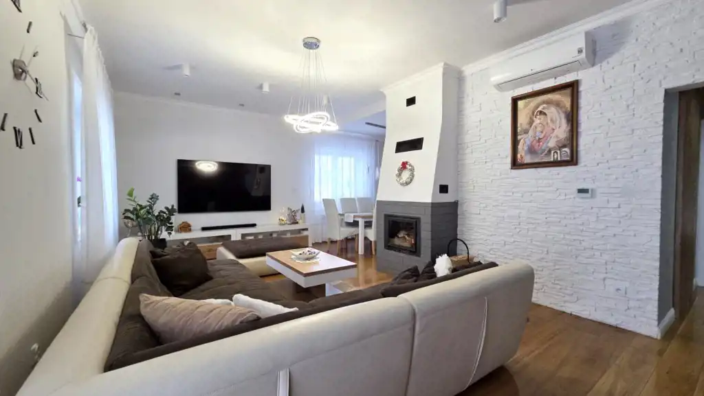 Sercem domu jest przestronny salon z jadalnią i aneksem kuchennym, w którym centralne miejsce zajmuje nastrojowy kominek. Z salonu prowadzi bezpośrednie wyjście na słoneczny taras (ekspozycja południowo-zachodnia) z widokiem na zadbany ogród. Na poddasze prowadzą dębowe schody.