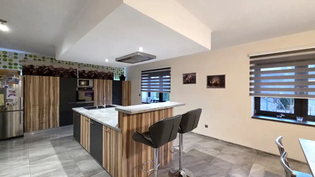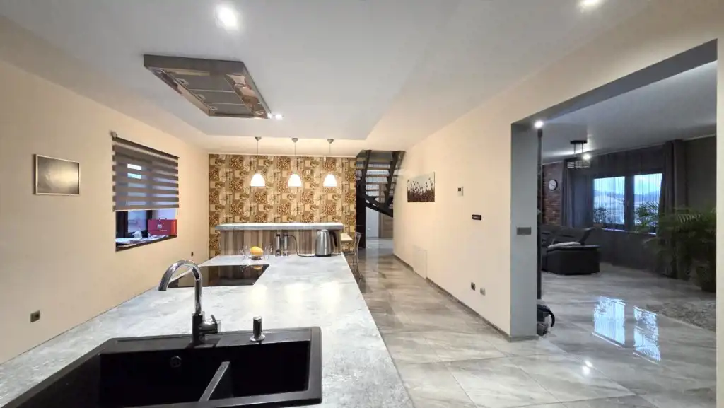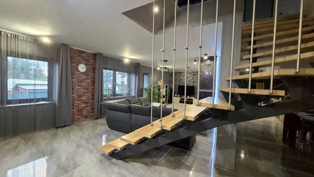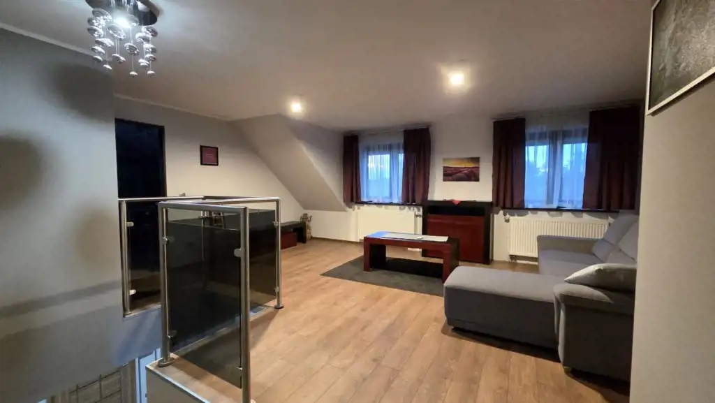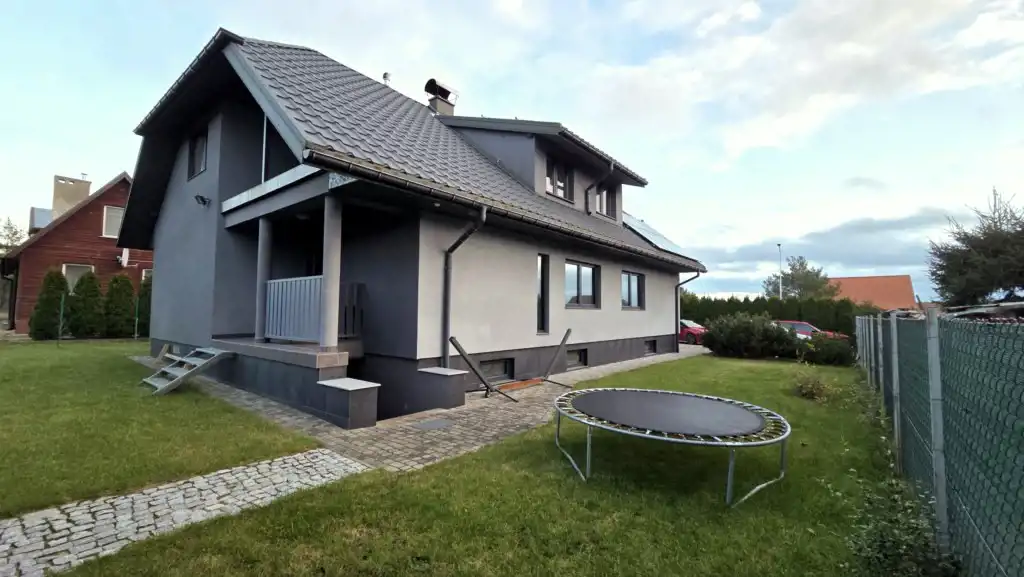 Dom został wybudowany w 2014 roku i utrzymany jest w bardzo dobrym stanie technicznym. Funkcjonalny układ dwóch poziomów w naturalny sposób dzieli przestrzeń na strefę dzienną i prywatną.