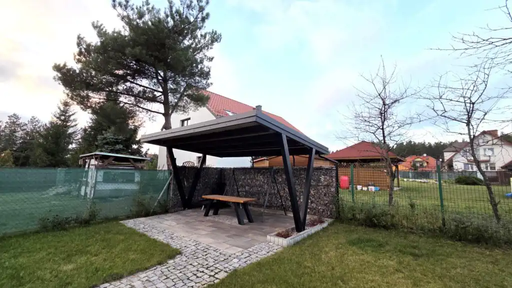 Nieruchomość wyróżnia się pięknie zagospodarowanym ogrodem z krzewami ozdobnymi. Na posesji znajduje się również wiata grillowa, usytuowana na utwardzonym podłożu z kostki i estetycznie wkomponowana w część kamiennego ogrodzenia. Kostka brukowa została ułożona także wokół domu, a całość dopełnia zadbany podjazd oraz wygodne ciągi piesze. Posesja jest w pełni ogrodzona, z reprezentacyjnym frontowym ogrodzeniem z kamienia, co zapewnia prywatność i poczucie bezpieczeństwa.