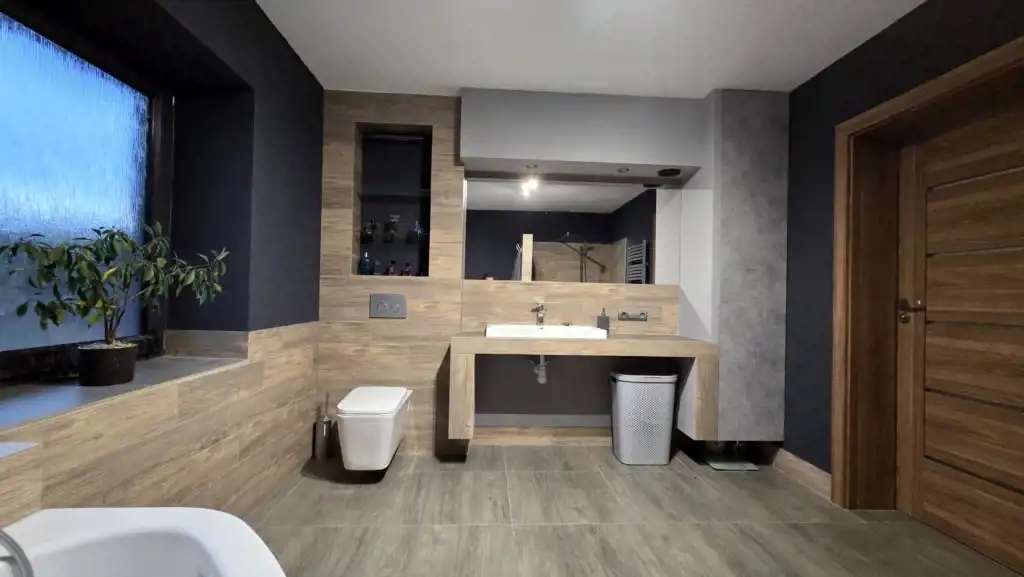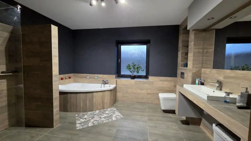 duża łazienka z wanną narożną oraz prysznicem z odpływem liniowym,