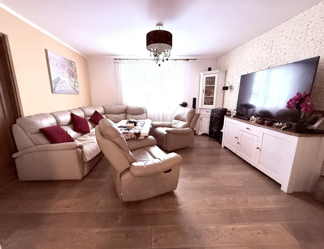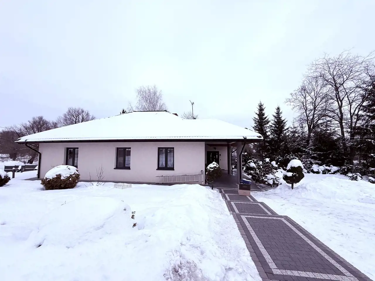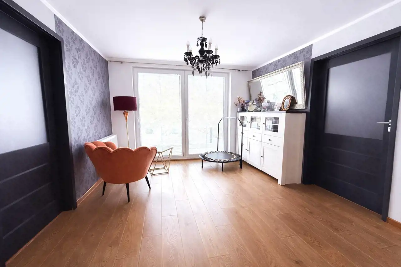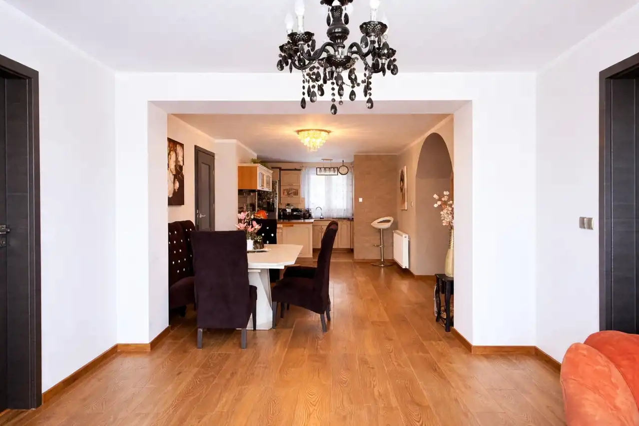 Na w pełni ogrodzonej, monitorowanej i doskonale zagospodarowanej działce znajduje się nowoczesny, wolnostojący dom parterowy o powierzchni użytkowej 120,37 m2, wybudowany w 2015 roku z wysokiej klasy materiałów z dbałością o każdy szczegół wykończenia. Dom zachwyca wysokim standardem wykończenia, ergonomią i funkcjonalnością, oferując komfort codziennego życia przez cały rok. Nowoczesne ogrzewanie pompą ciepła zapewnia energooszczędność i wygodę, a solidne okna PCV oraz niepowtarzalne drzwi wejściowe podkreślają jakość wykonania i charakter nieruchomości. Dodatkowym atutem jest ogrzewanie podłogowe w korytarzu i łazience oraz starannie przemyślany układ pomieszczeń, który sprzyja wygodzie i płynnej organizacji przestrzeni. To dom zaprojektowany tak, by łączyć estetykę z praktycznością i odpowiadać na potrzeby najbardziej wymagających mieszkańców.