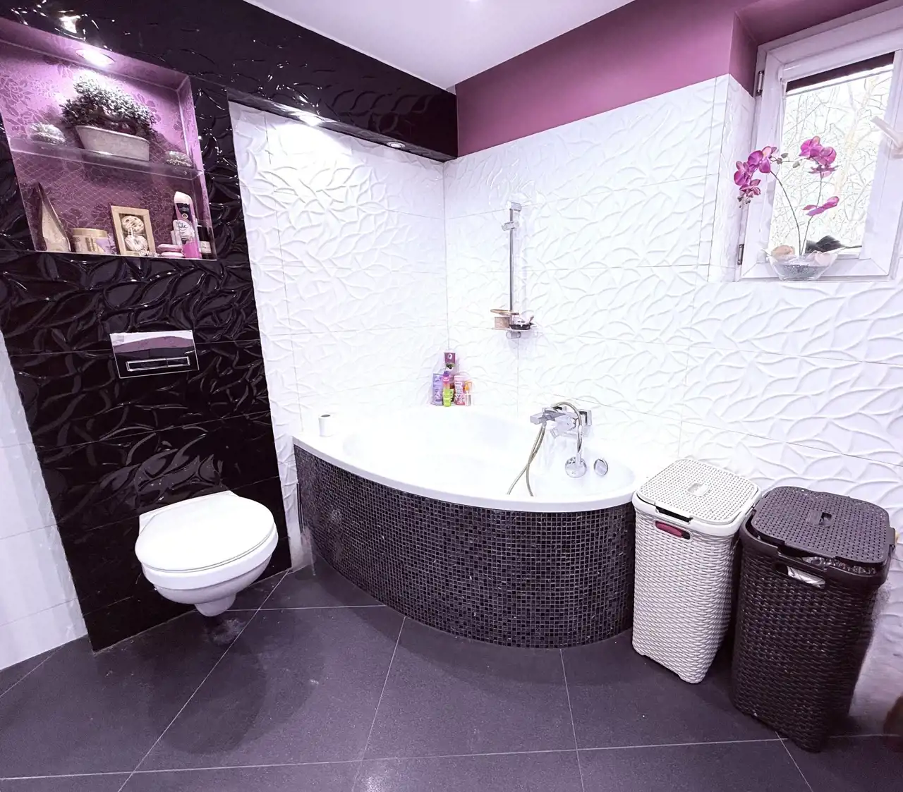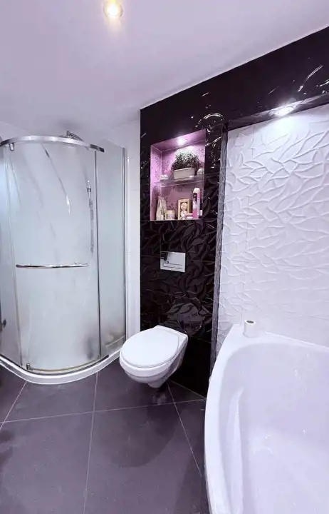 - duża, elegancka łazienka z wanną i prysznicem,
