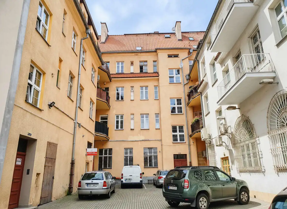 Okna oraz parking znajdują się od strony podwórza, natomiast wejście możliwe jest zarówno od podwórza jak i od strony ulicy przez klatkę schodową.