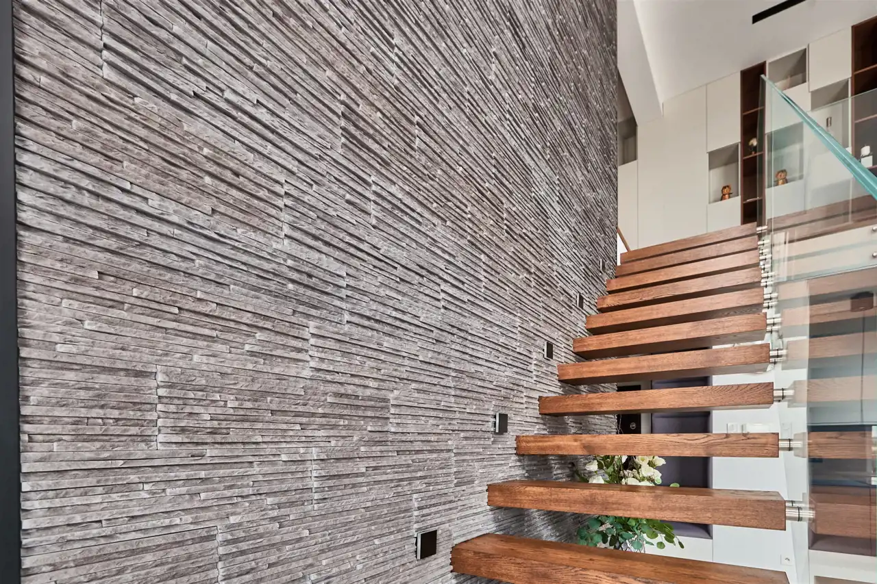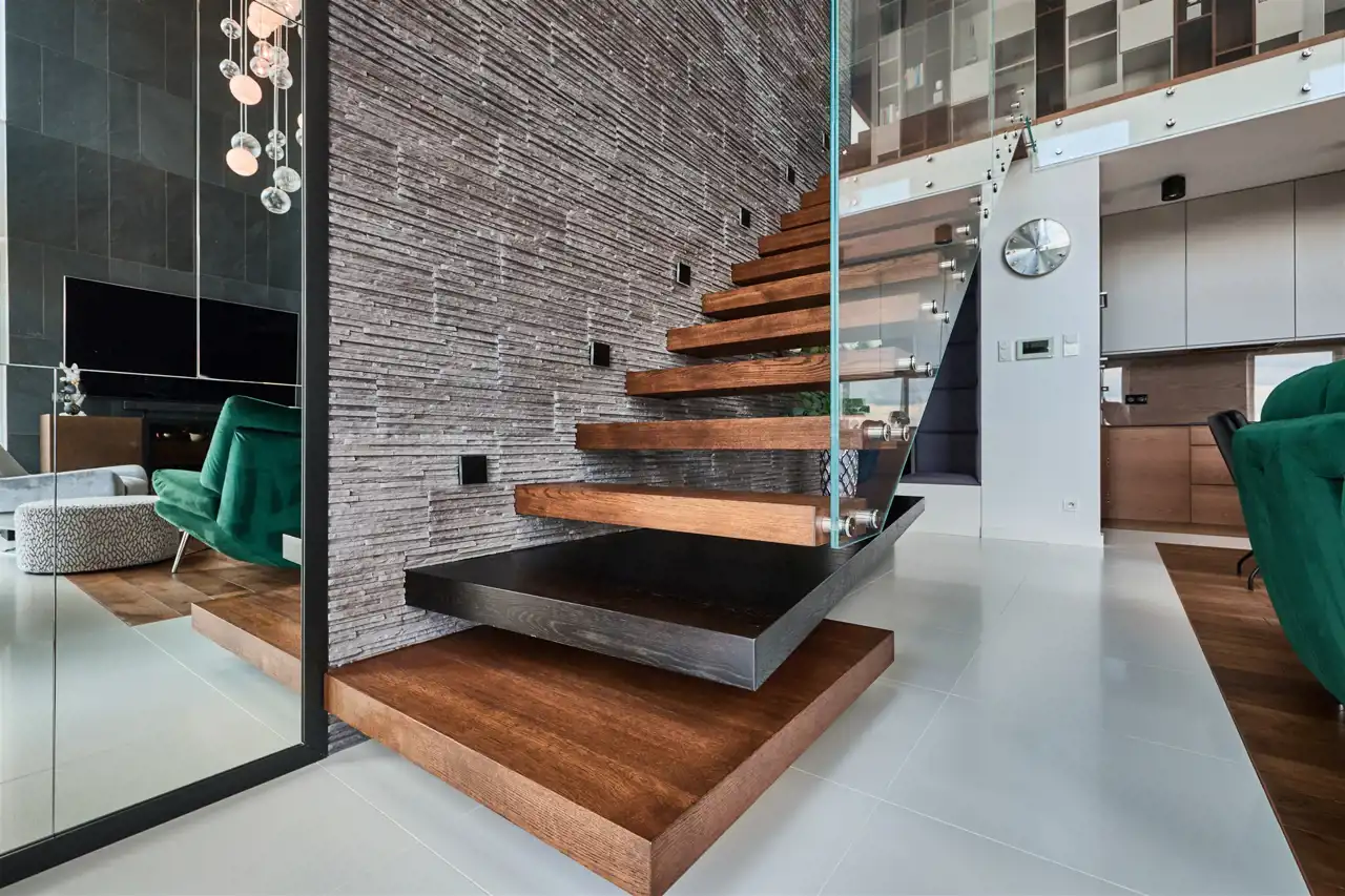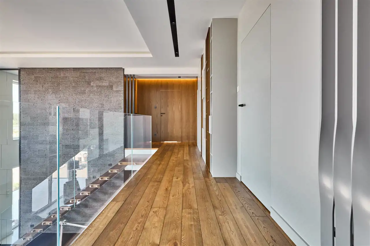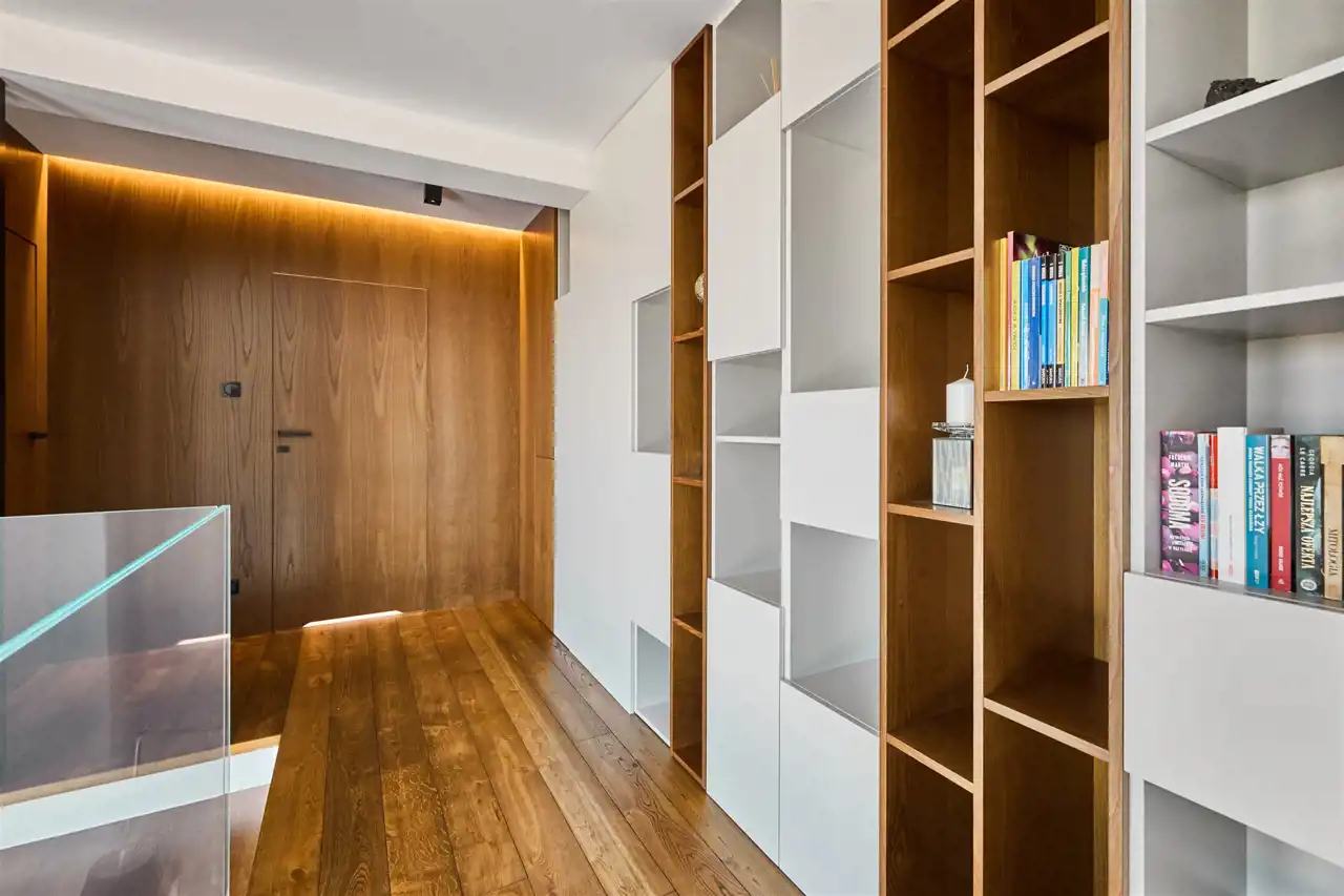 na podłodze szlachetna deska dębowa, która płynnie łączy się ze schodami prowadzącymi na antresolę.