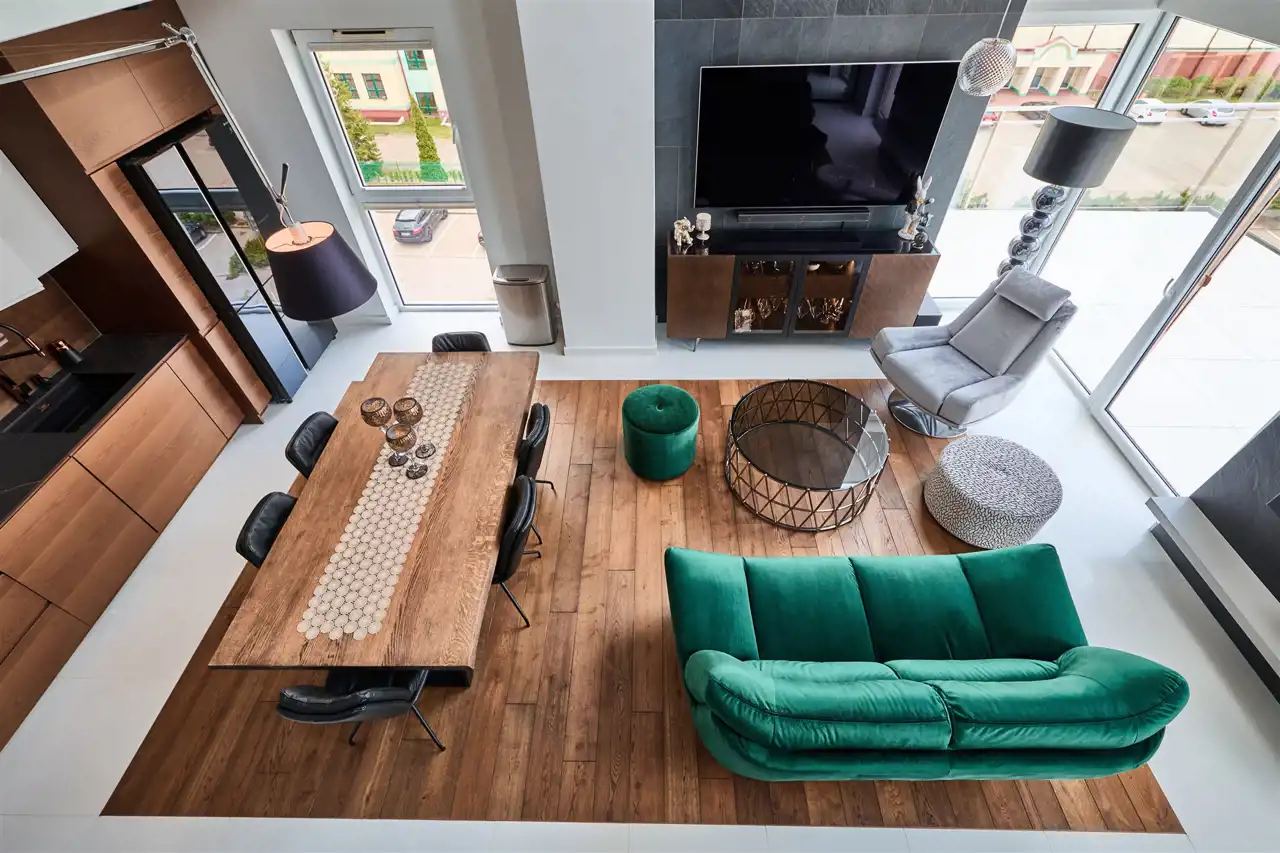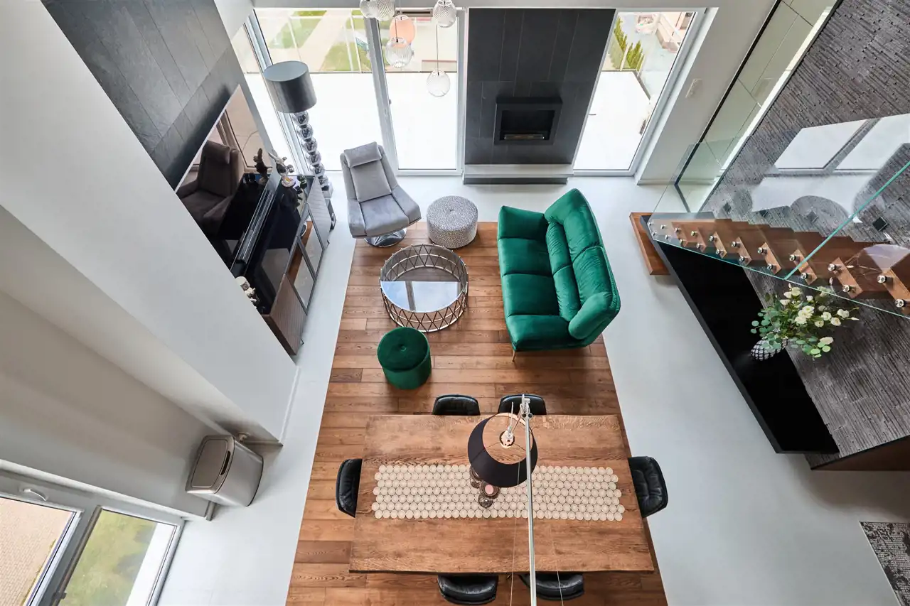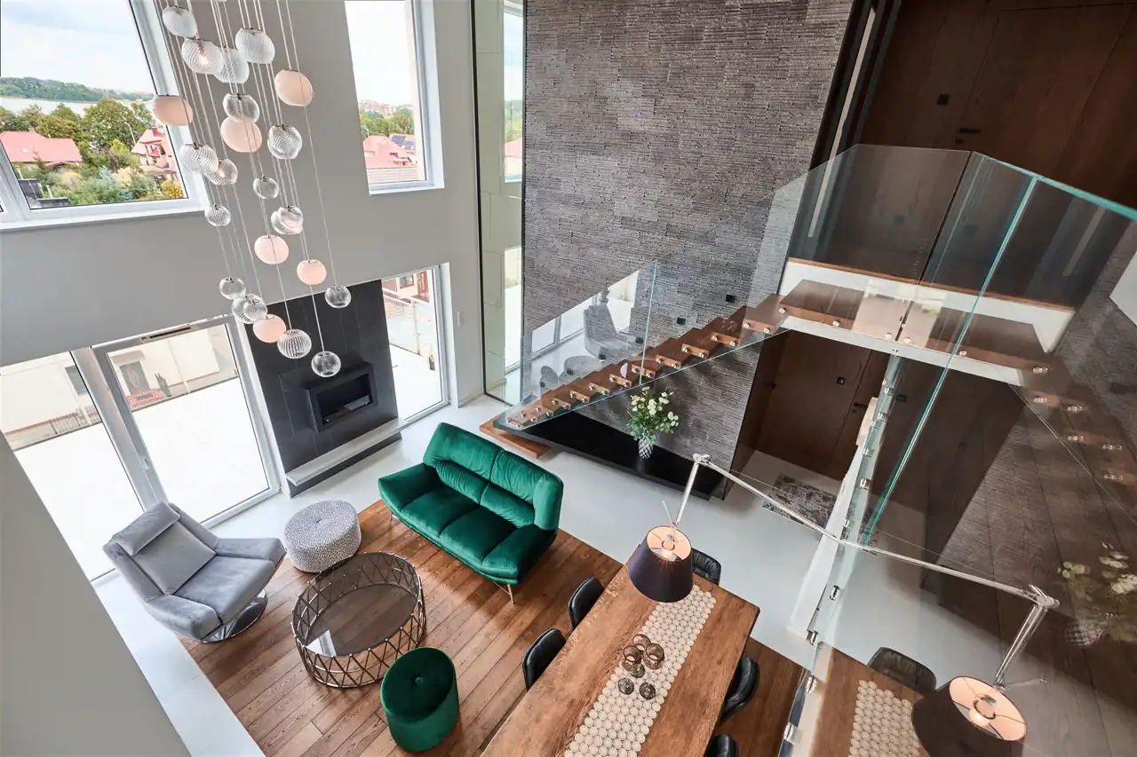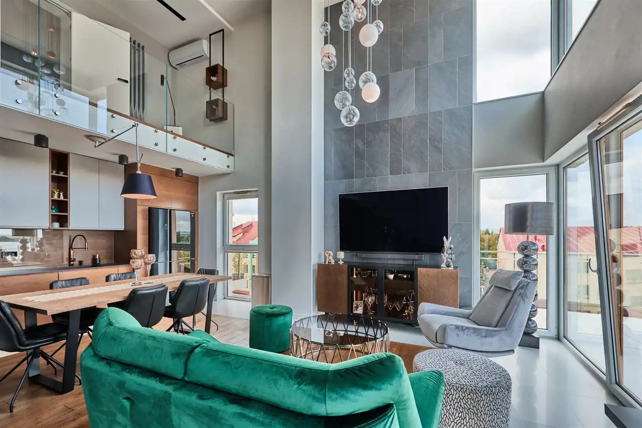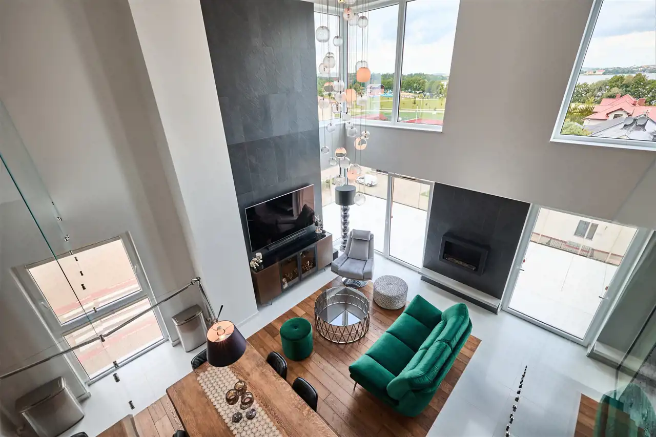 przestronny, jasny salon z kuchnią i ogromnymi przeszkleniami,