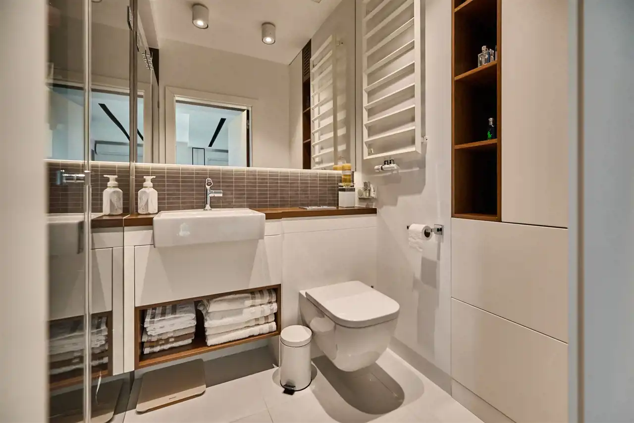 stylowa łazienka dyskretnie ukryta za drewnianą ścianą,