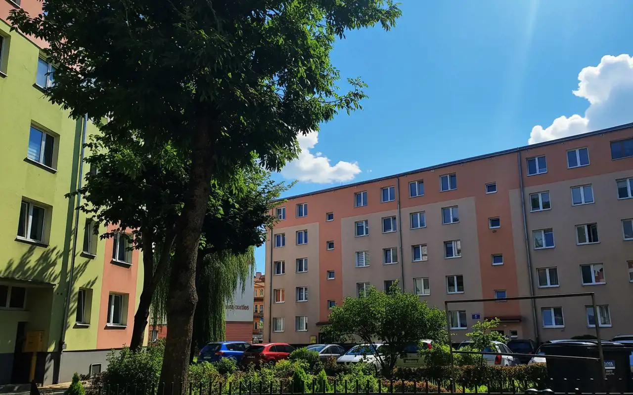Przed budynkiem duży parking dostępny tylko dla właścicieli mieszkań dwóch bloków.