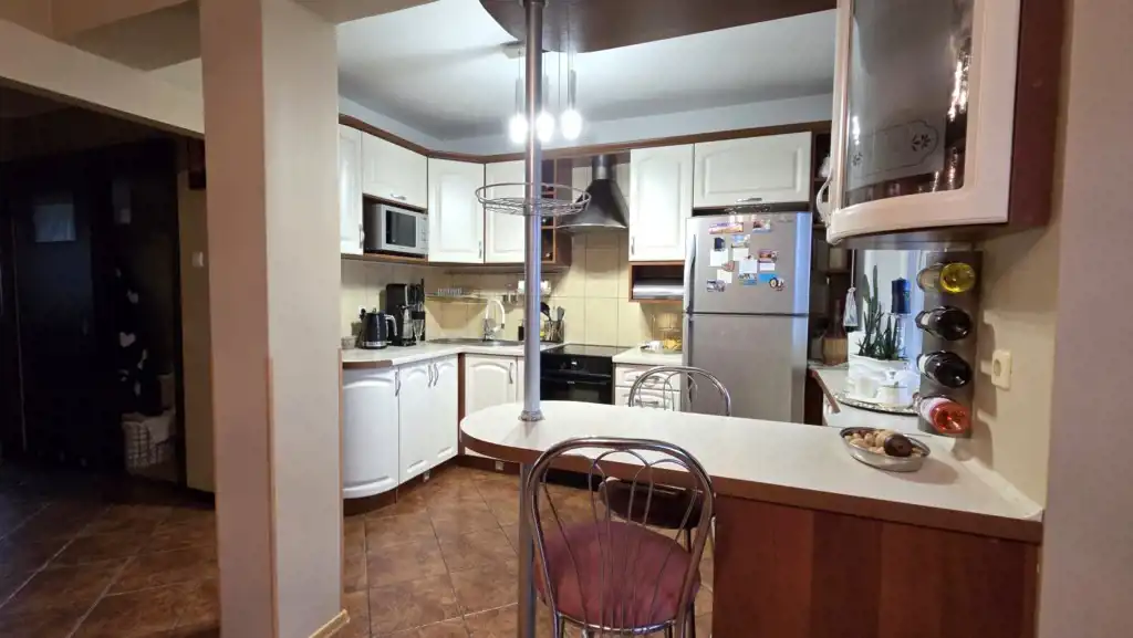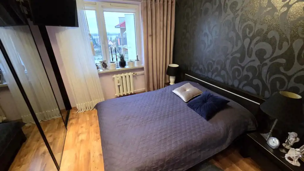 - Komfortowa sypialnia z dużą szafą z przesuwnymi, dymionymi lustrami oraz łóżkiem i szafkami nocnymi – idealne miejsce odpoczynku.