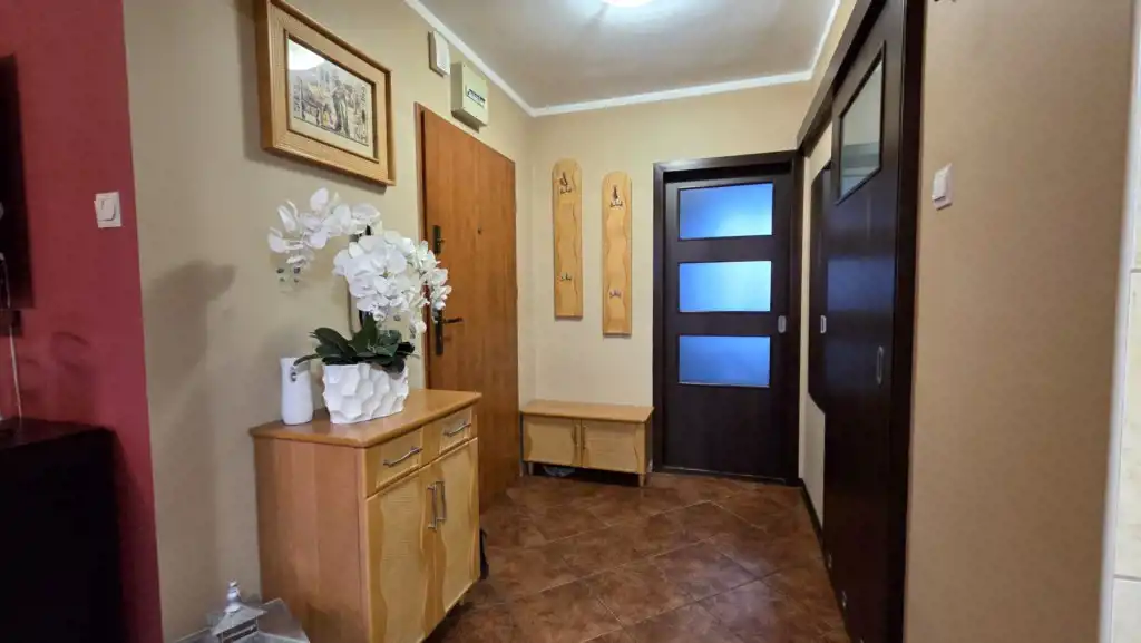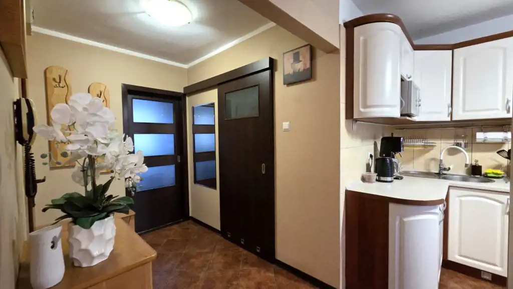 Mieszkanie jest niezwykle zadbane – gładkie ściany, tapeta w sypialni, panele w świetnym stanie, okna PCV, drzwi antywłamaniowe oraz drzwi wewnętrzne przesuwne, które zapewniają komfort i wygodę. W cenie mieszkania pozostaje kompletne umeblowanie, oświetlenie, zasłony oraz karnisze.