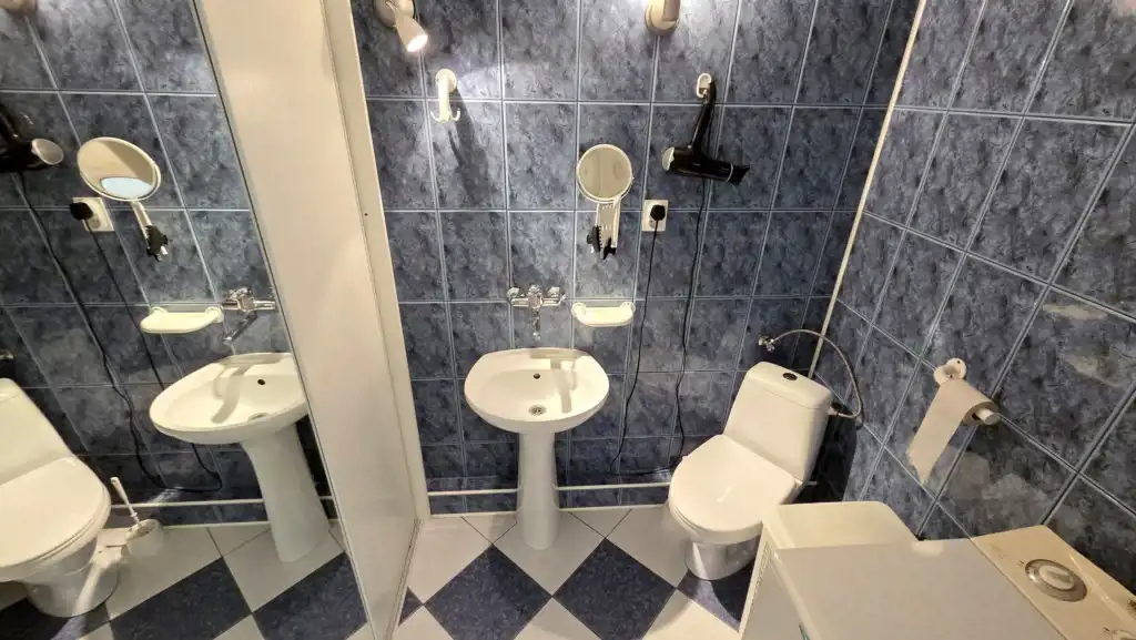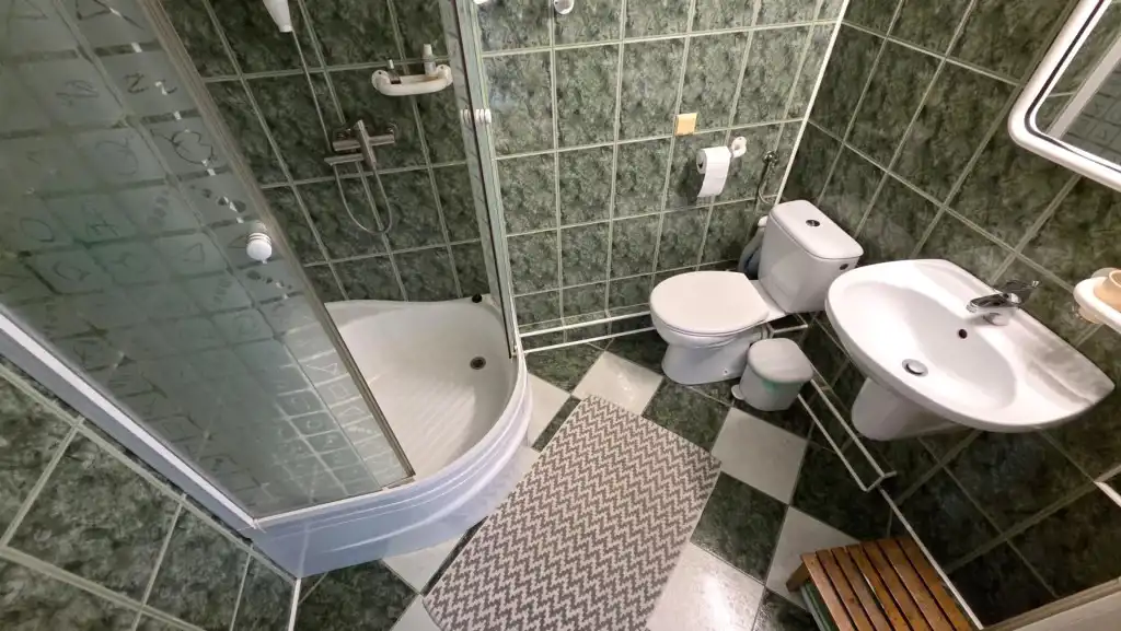 Druga łazienka z kabiną prysznicową, umywalką i WC.