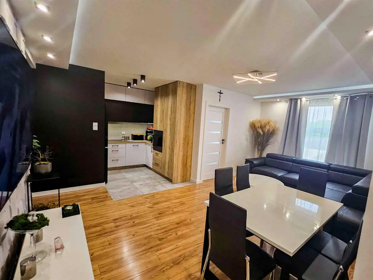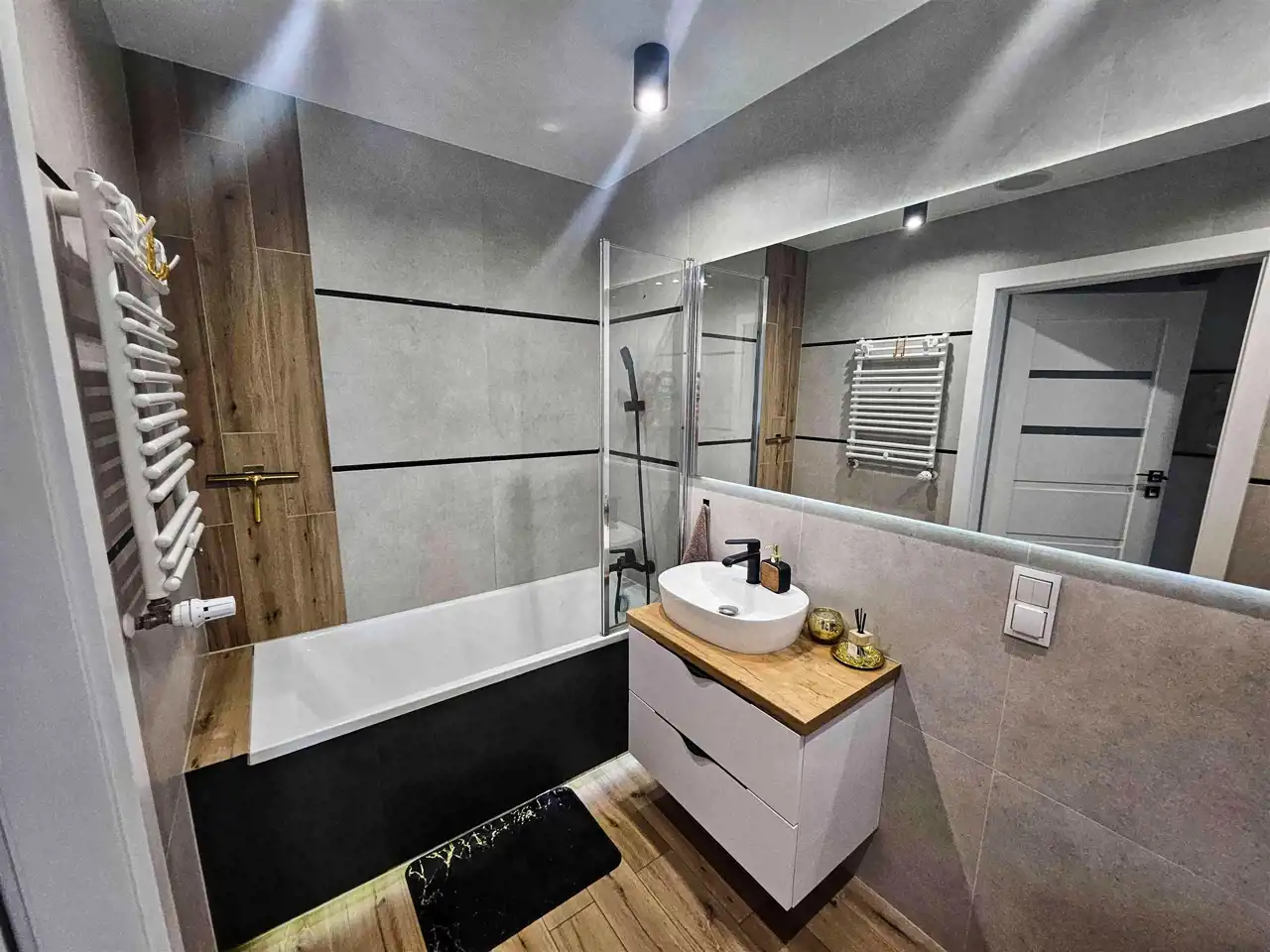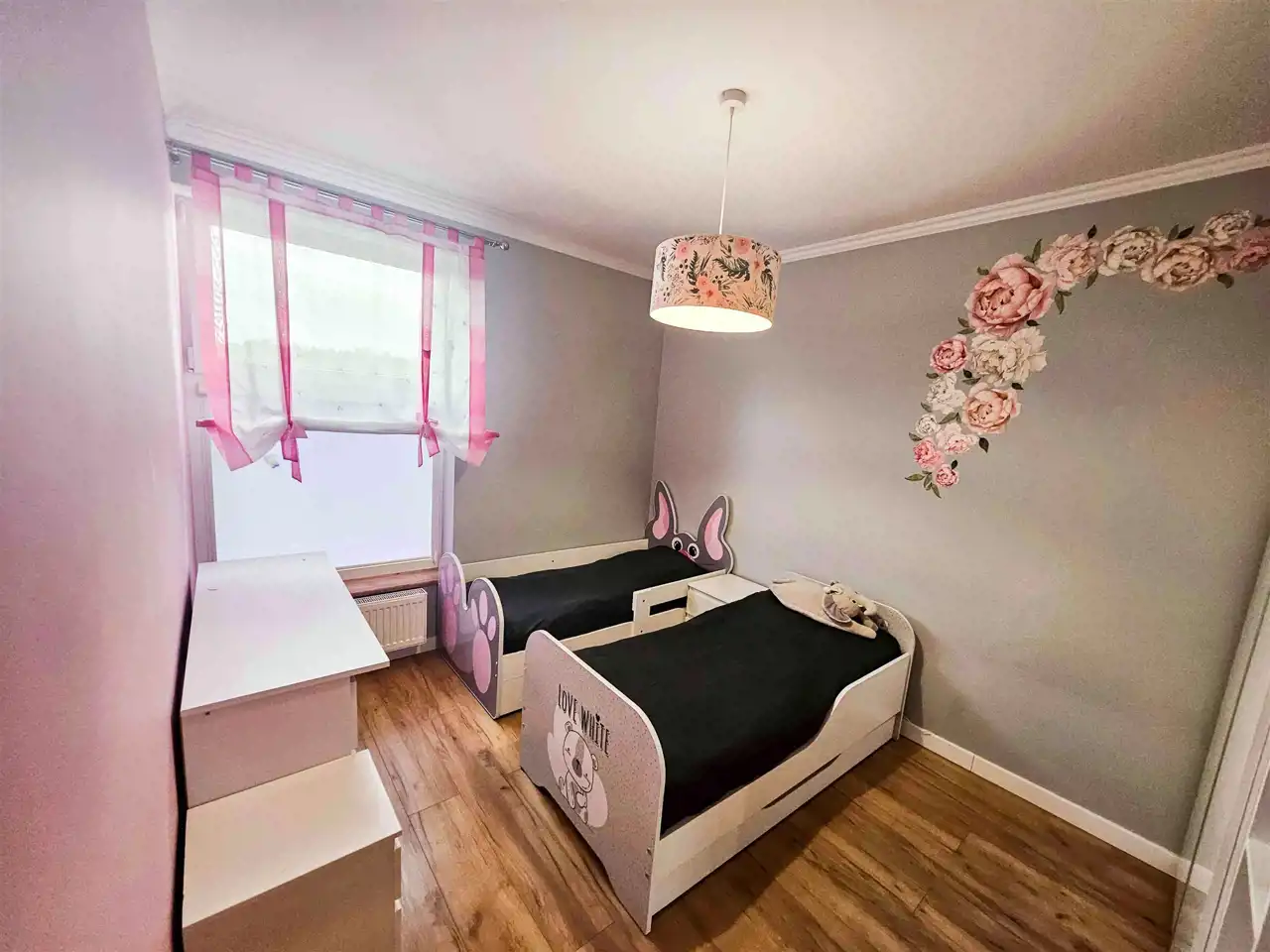 Mieszkanie o pow. 65,24 m2 usytuowane na II piętrze w budynku przy ul. Matki Teresy z Kalkuty 4 w Ełku. Lokal składa się z salonu z aneksem kuchennym, 3 sypialni, łazienki z wc oraz przedpokoju. Budynek z 2019 r., winda. Mieszkanie o bardzo dobrym układzie funkcjonalnym, dwustronne, dobrze doświetlone. Lokal w bardzo dobrym stanie technicznym, o podwyższonym standardzie wykończenia. Na podłogach: terakota (aneks, łazienka, przedpokój), panele (pokoje). Stolarka drzwiowa płytowa. W aneksie kuchennym stała zabudowa. Wyposażenie kuchni: płyta ceramiczna, piekarnik i mikrofalówka, okap kuchenny, lodówka oraz zmywarka. Lokal wyposażony jest w klimatyzację punktową (salon z aneksem). Pojemna szafa w przedpokoju. W jednaj z sypialni napinany sufit. W salonie, na ścianach tynki ozdobne oraz panele ścienne 3D, sufity w części podwieszane z oświetleniem punktowym. W łazience wanna.
