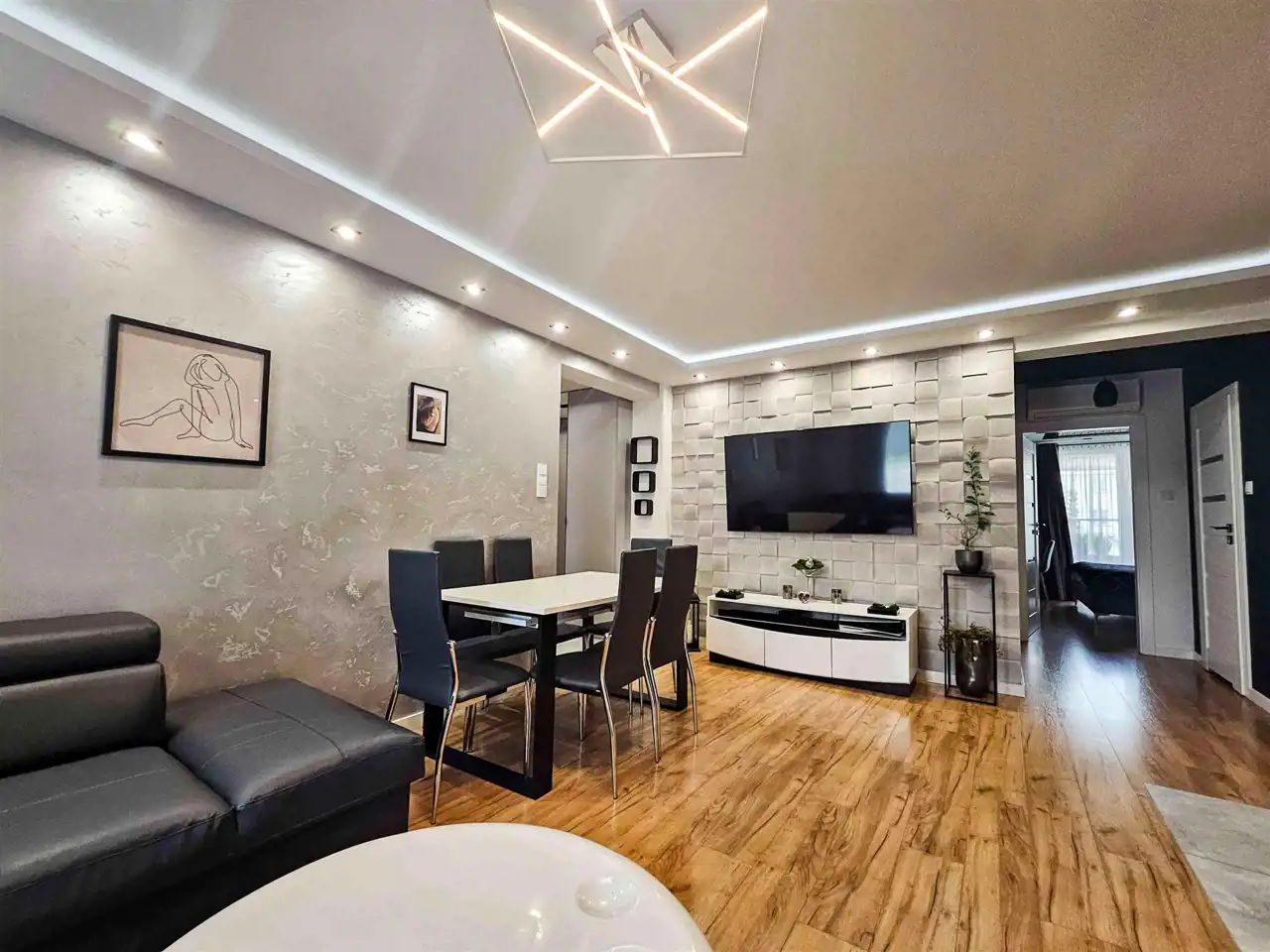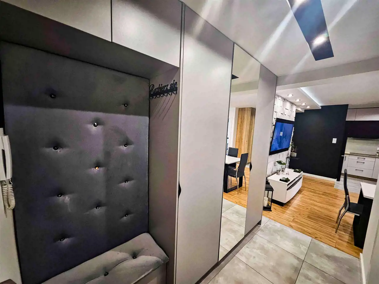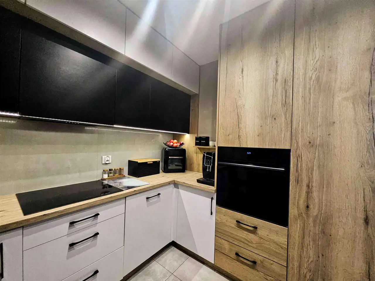 Mieszkanie o pow. 65,24 m2 usytuowane na II piętrze w budynku przy ul. Matki Teresy z Kalkuty 4 w Ełku. Lokal składa się z salonu z aneksem kuchennym, 3 sypialni, łazienki z wc oraz przedpokoju. Budynek z 2019 r., winda. Mieszkanie o bardzo dobrym układzie funkcjonalnym, dwustronne, dobrze doświetlone. Lokal w bardzo dobrym stanie technicznym, o podwyższonym standardzie wykończenia. Na podłogach: terakota (aneks, łazienka, przedpokój), panele (pokoje). Stolarka drzwiowa płytowa. W aneksie kuchennym stała zabudowa. Wyposażenie kuchni: płyta ceramiczna, piekarnik i mikrofalówka, okap kuchenny, lodówka oraz zmywarka. Lokal wyposażony jest w klimatyzację punktową (salon z aneksem). Pojemna szafa w przedpokoju. W jednaj z sypialni napinany sufit. W salonie, na ścianach tynki ozdobne oraz panele ścienne 3D, sufity w części podwieszane z oświetleniem punktowym. W łazience wanna.