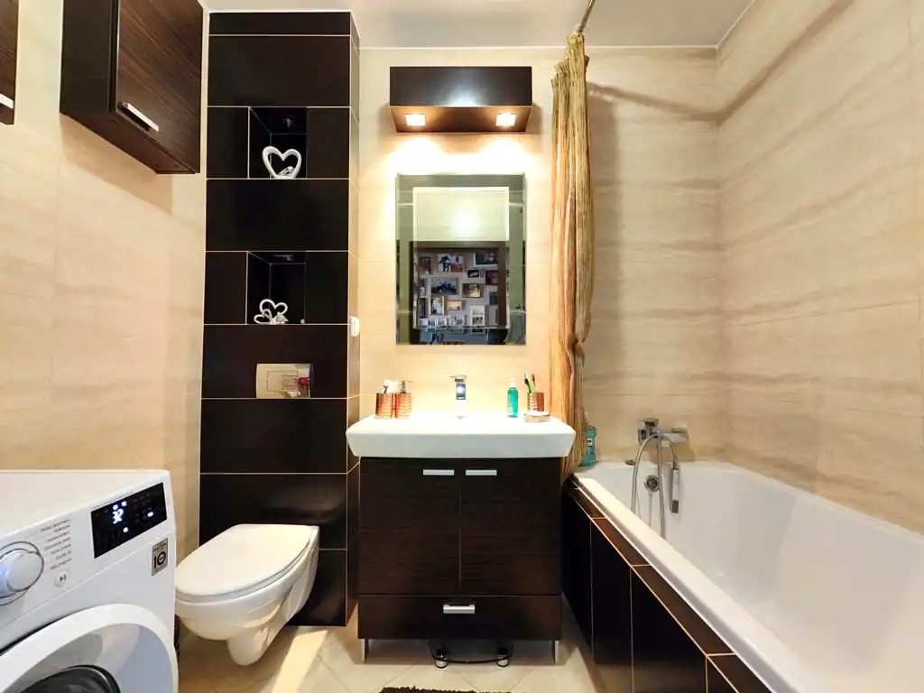 Łazienka – z wanną, umywalką, szafkami oraz pralką.