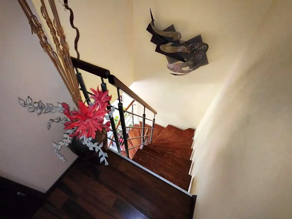 Podłogi: panele w pokojach i górnym przedpokoju, gres w łazienkach, kuchni i dolnym przedpokoju.