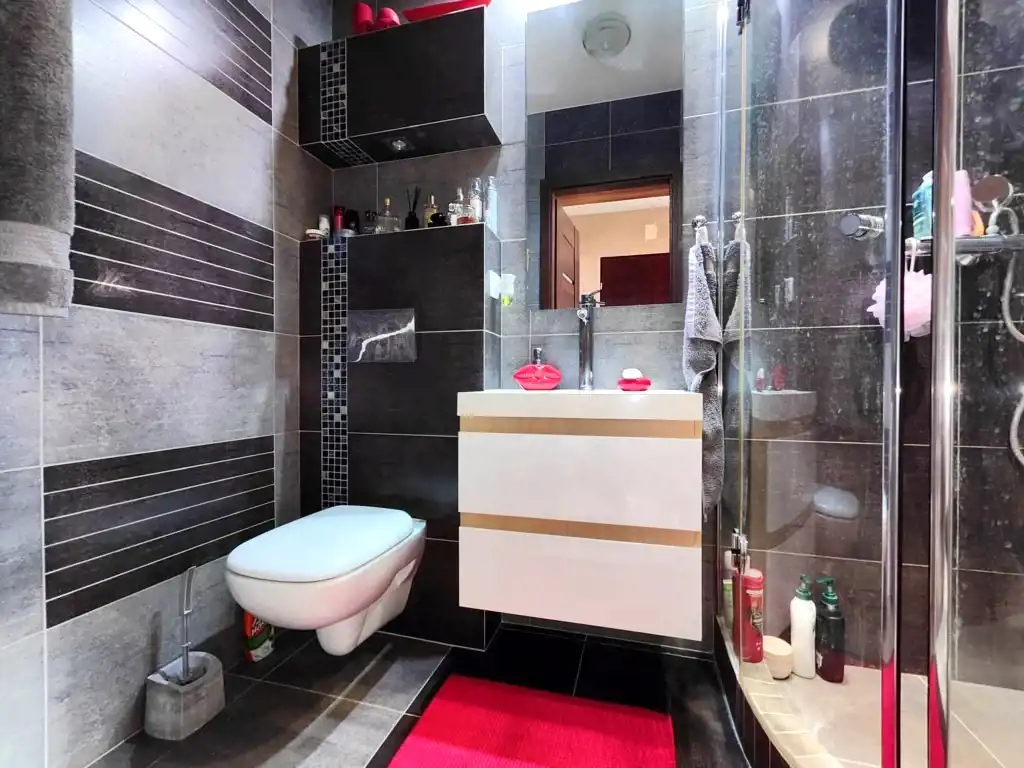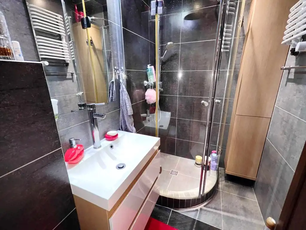Łazienka – nowoczesna, z prysznicem, umywalką i praktycznymi szafkami.
