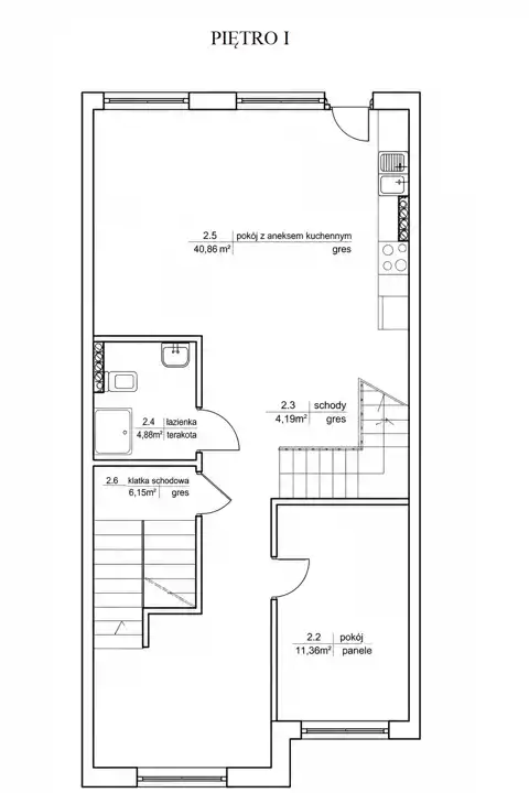 Do lokalu prowadzi niezależne wejście przez klatkę schodową. Na pierwszym poziomie znajduje się przestronna część dzienna z salonem z aneksem kuchennym oraz wyjściem na duży balkon. Na tym poziomie zaplanowano również funkcjonalną sypialnię, łazienkę oraz duży przedpokój z korytarzem.
