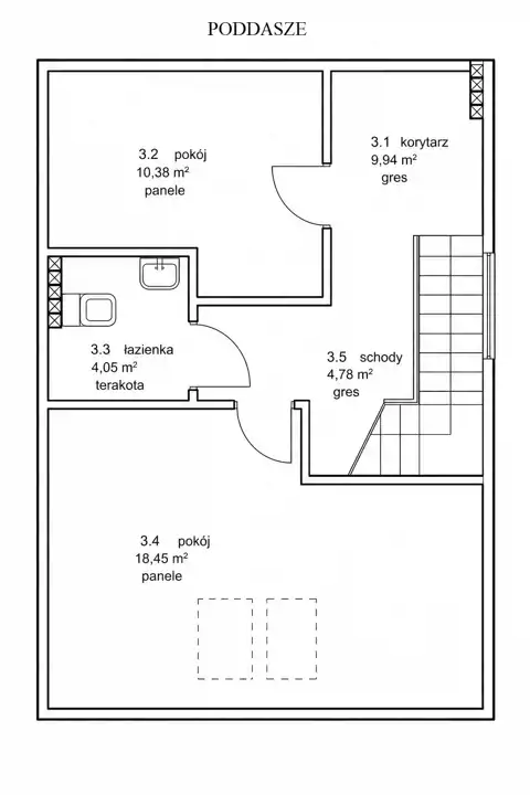 Z salonu na poddasze prowadzą wygodne, murowane schody. Drugi poziom tworzą dwie ustawne sypialnie doświetlone oknami dachowymi, łazienka oraz przedpokój.