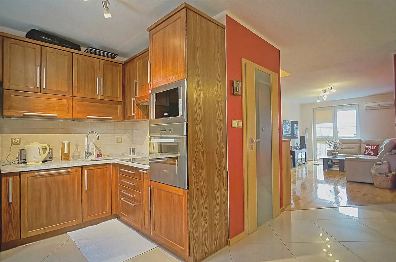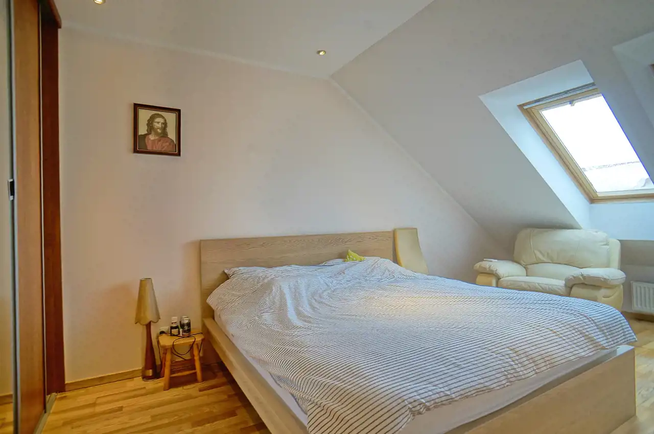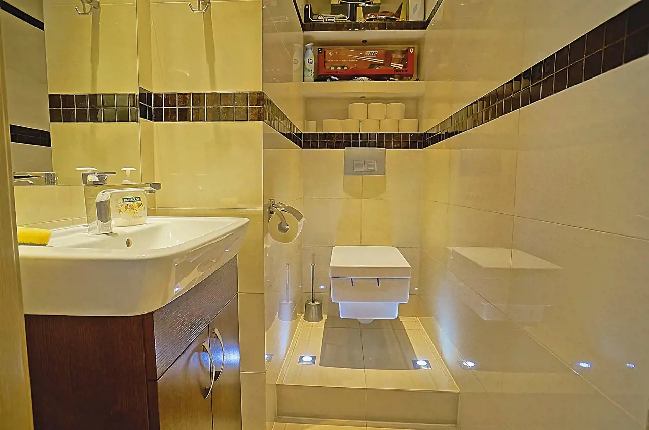 Na pierwszym poziomie znajduje się salon z balkonem, jadalnia z aneksem kuchennym oraz wc. Drugi poziom to dwie sypialnie i duża łazienka z wanną prysznicem i sauną. W łazience ogrzewanie podłogowe a wszystkie pokoje są klimatyzowane.