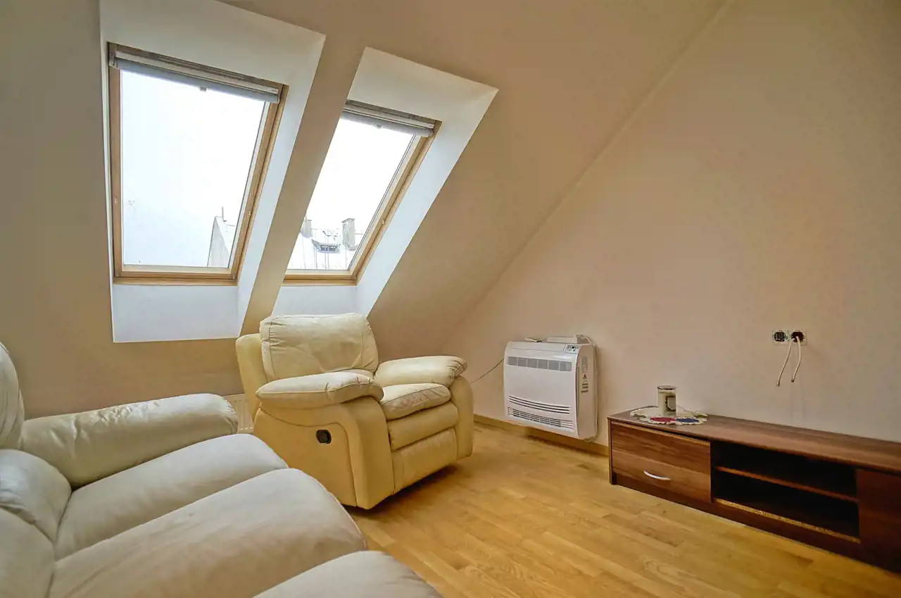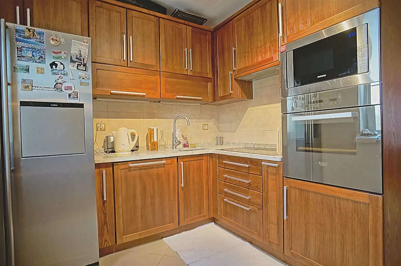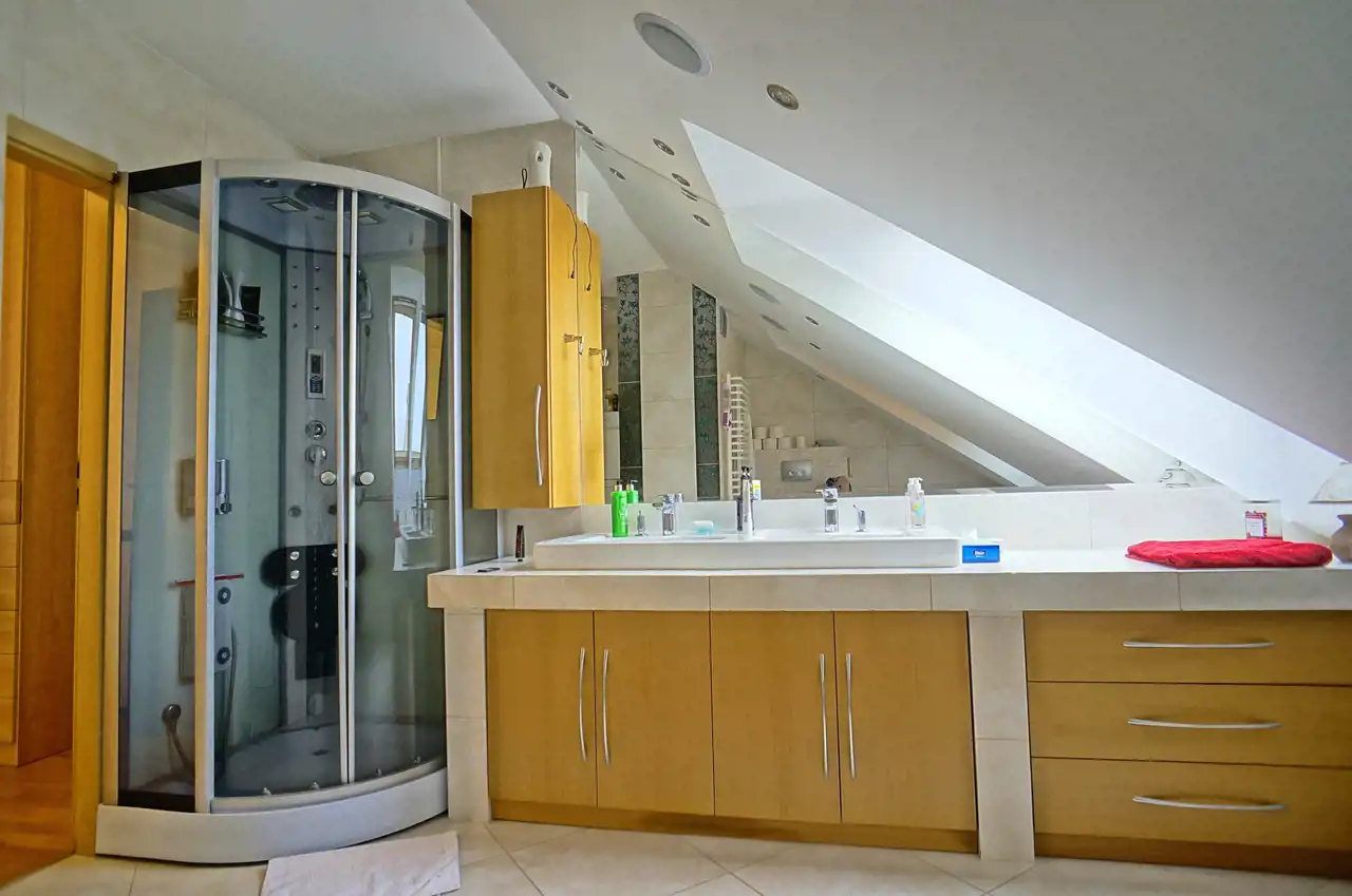 Na pierwszym poziomie znajduje się salon z balkonem, jadalnia z aneksem kuchennym oraz wc. Drugi poziom to dwie sypialnie i duża łazienka z wanną prysznicem i sauną. W łazience ogrzewanie podłogowe a wszystkie pokoje są klimatyzowane.