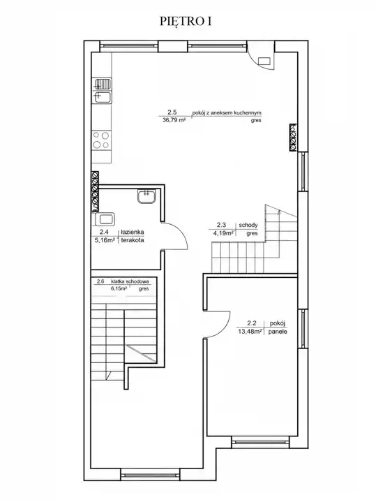 Do lokalu prowadzi niezależne wejście przez klatkę schodową. Na pierwszym poziomie znajduje się przestronna część dzienna z salonem z aneksem kuchennym oraz wyjściem na duży balkon. Na tym poziomie zaplanowano również funkcjonalną sypialnię, łazienkę oraz duży przedpokój z korytarzem.