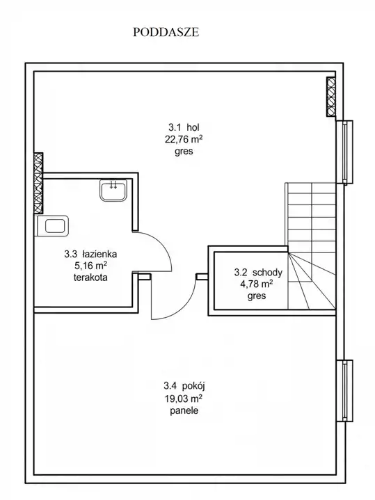 Z salonu na poddasze prowadzą wygodne, murowane schody. Drugi poziom tworzą dwie ustawne sypialnie doświetlone oknami dachowymi, łazienka oraz przedpokój.