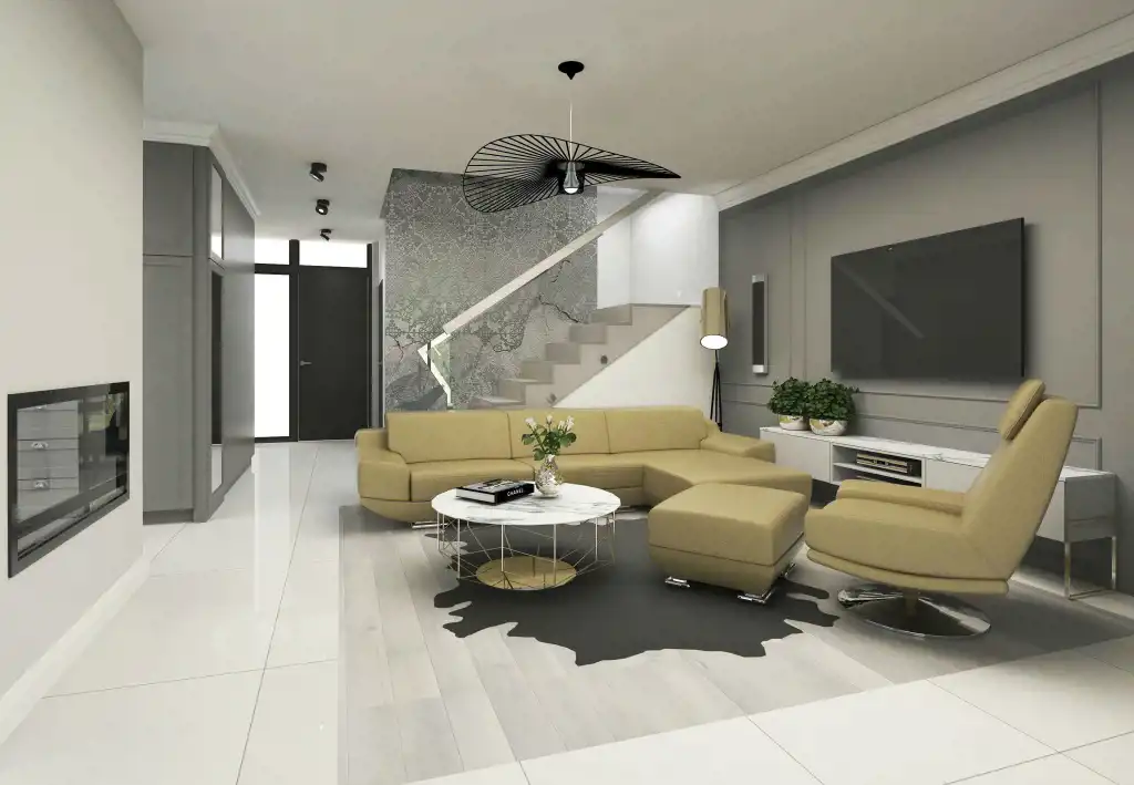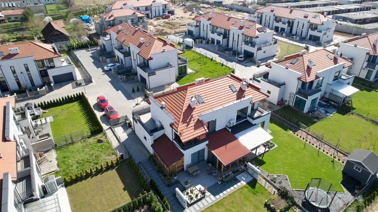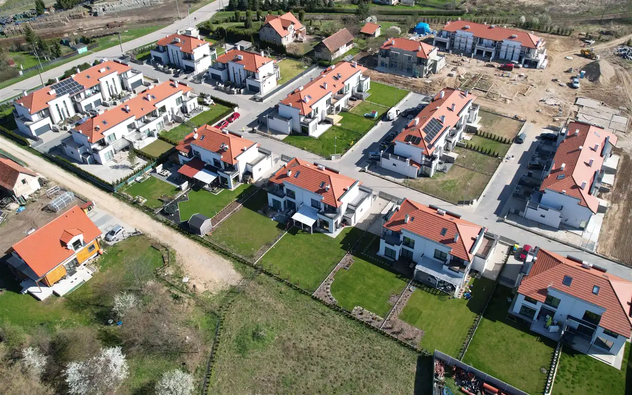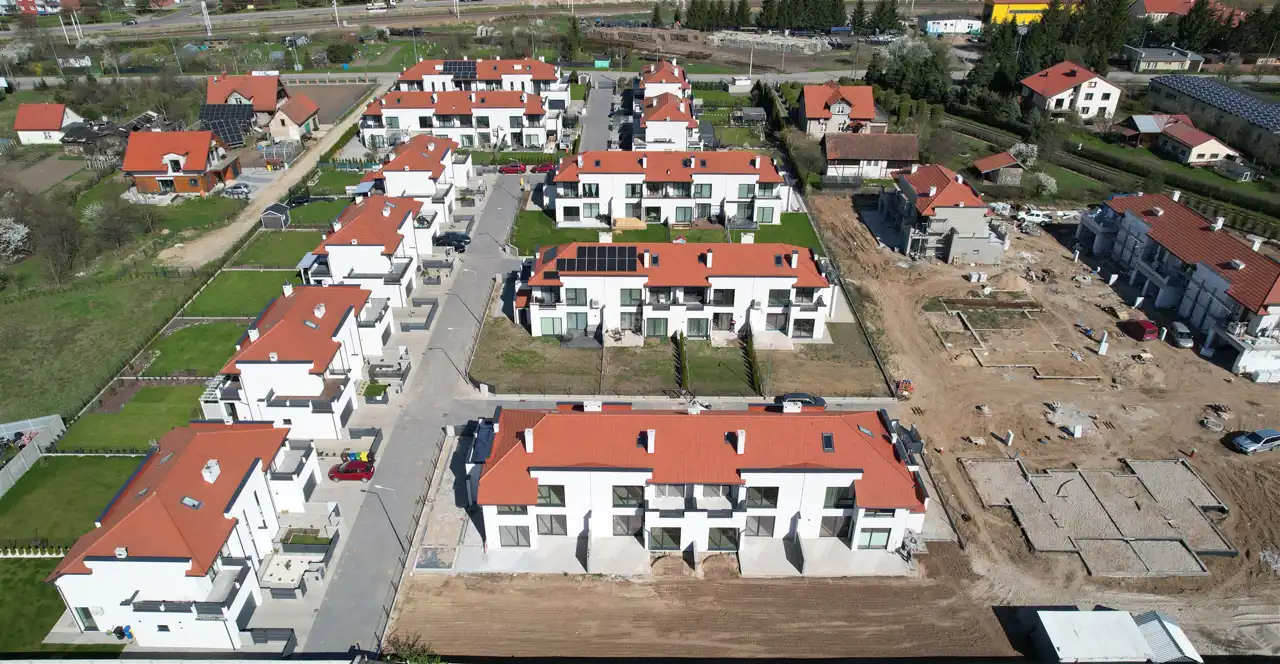 Domy są przekazywane nabywcom w standardzie deweloperskim z uruchomionymi instalacjami, wykonanymi tynkami wewnętrznymi i przygotowanymi podłożami pod posadzki.