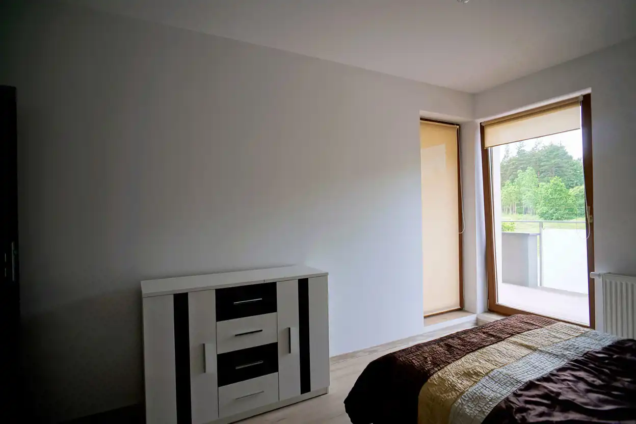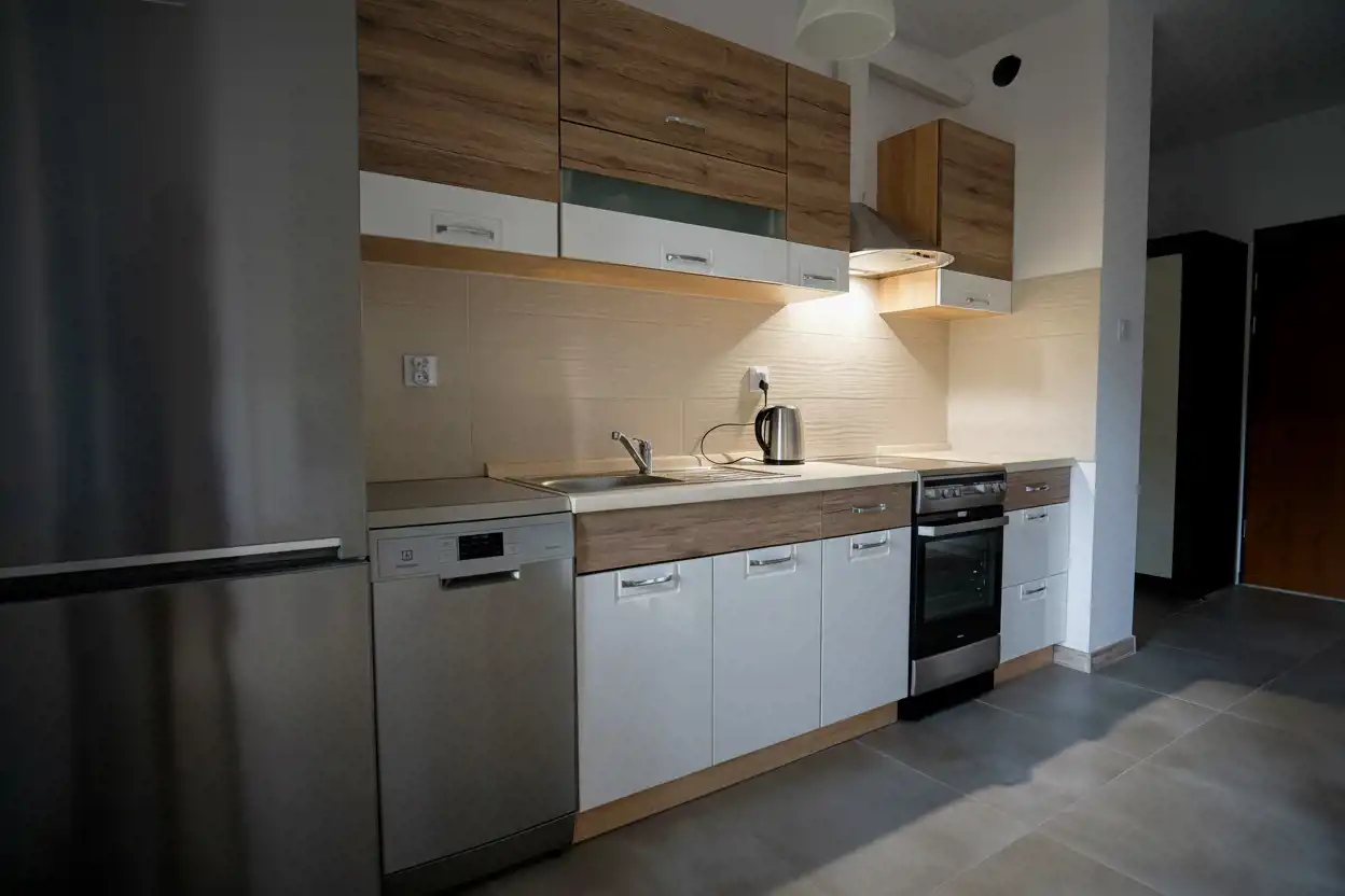 Lokal nowy, zadbany, wykończony w bardzo dobrym standardzie. Wyposażony w meble kuchenne, AGD (lodówka, kuchenka, zmywarka, pralka), w sypialni: łóżko, komoda oraz szafa, natomiast w salonie rogówka, szafka pod telewizor oraz komoda z dwoma witrynami.