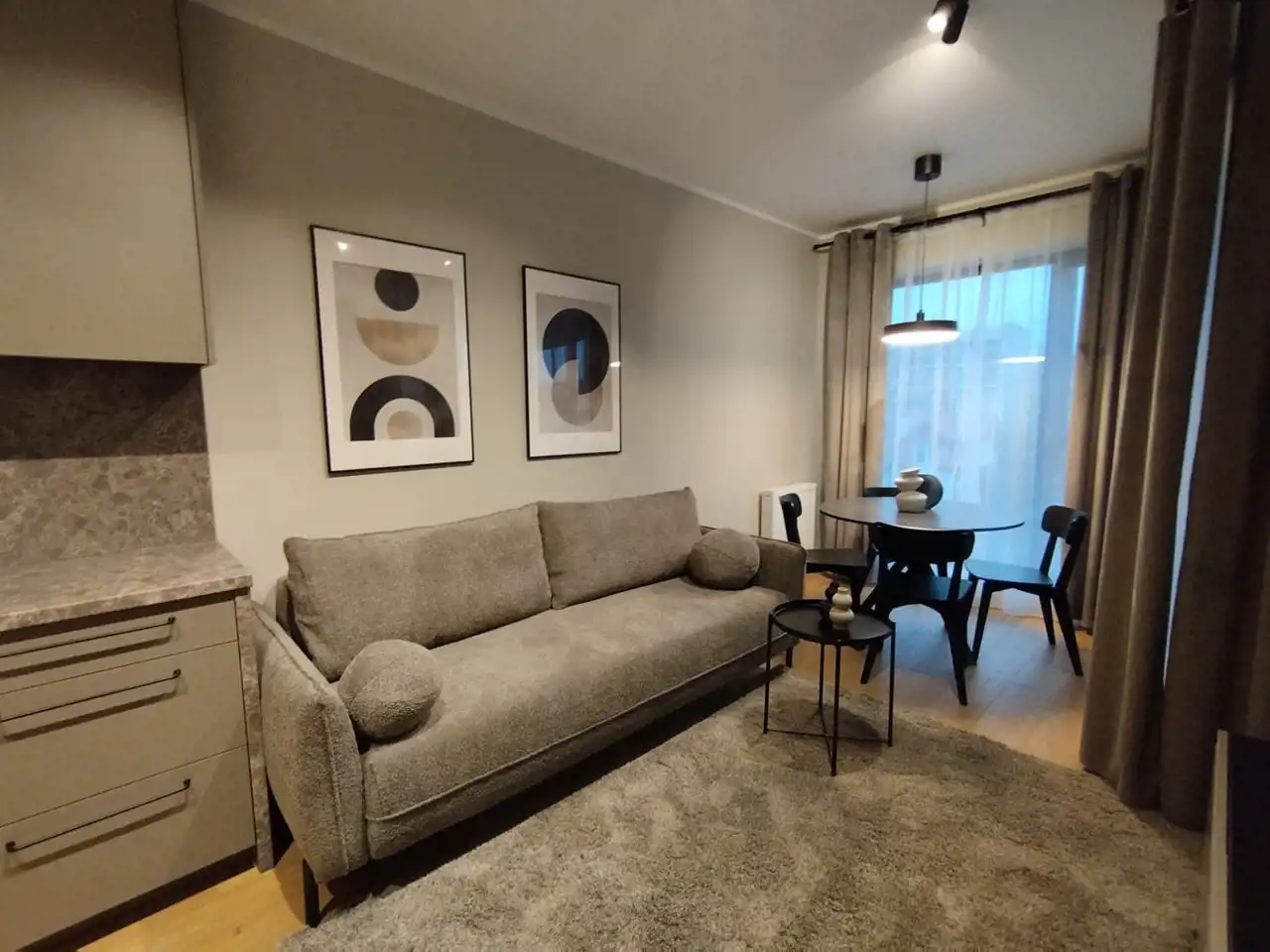- Salonu z aneksem kuchennym z wyjściem na przestronny, dobrze nasłoneczniony balkon