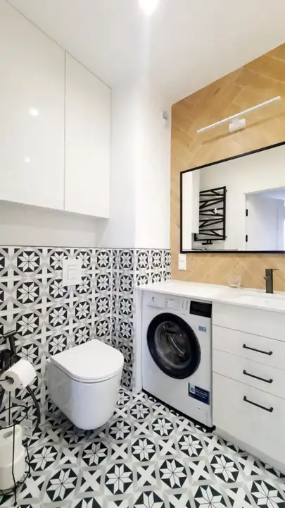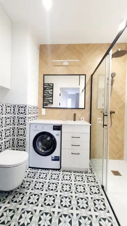 Łazienka: stylowa, z dużym prysznicem i pralką.
