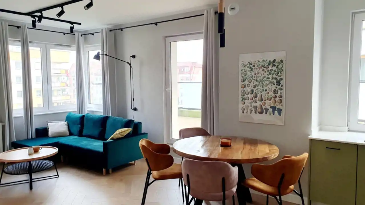 Salon z aneksem kuchennym: z wyjściem na przestronny taras, wyposażony w wygodny narożnik z funkcją spania oraz stół z krzesłami.