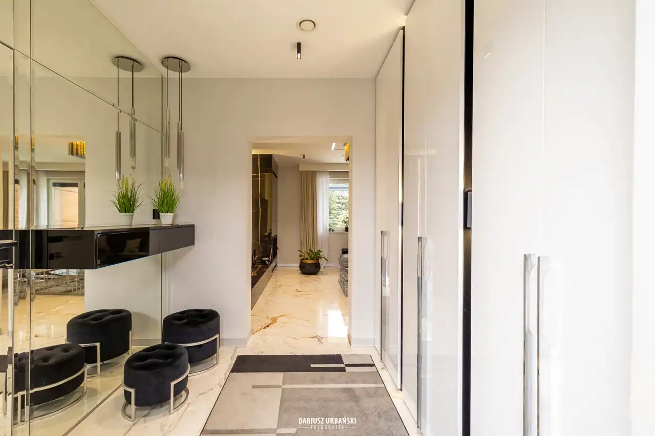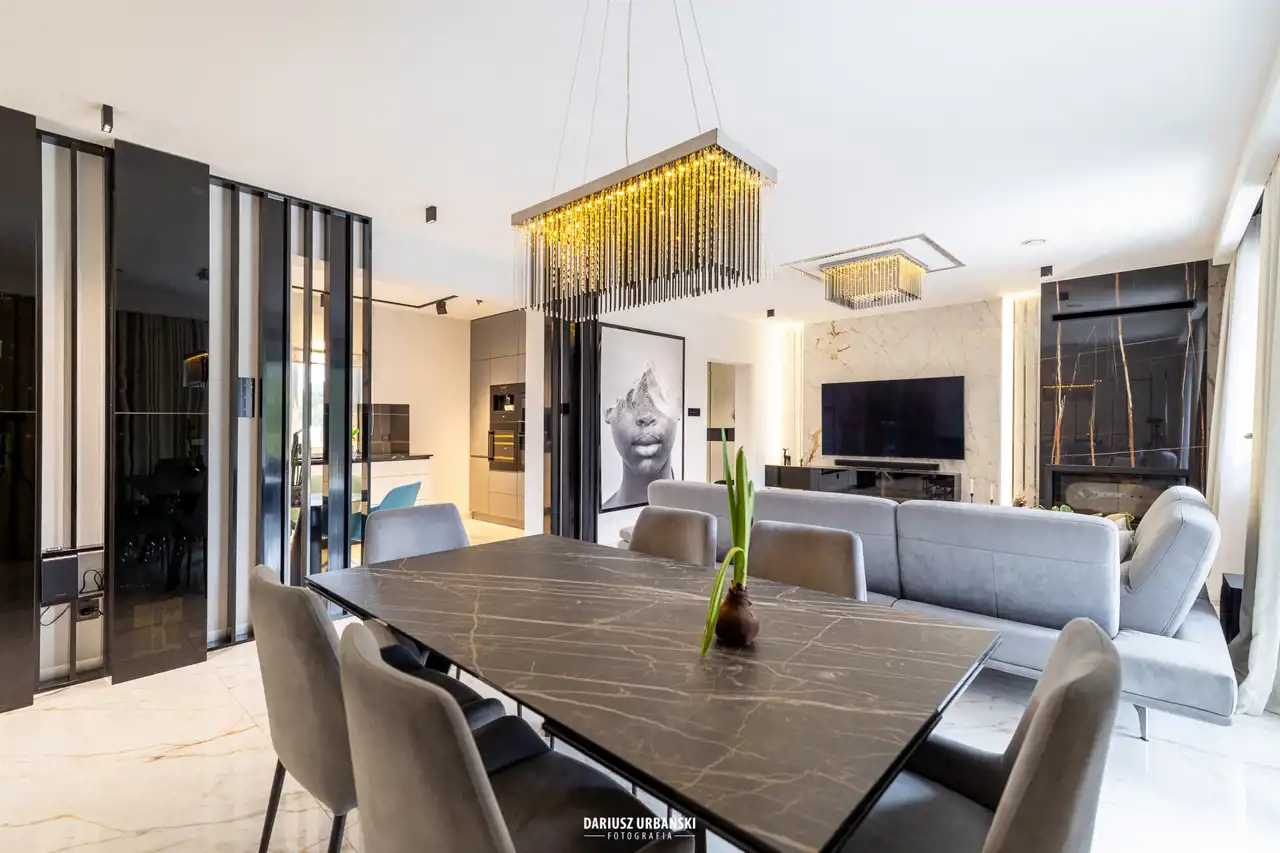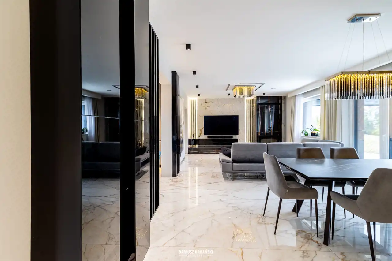 Zapraszając Państwa do wnętrza, tej nietuzinkowej nieruchomości. Pięknym wejściem połączonym z przedpokojem wchodzimy do części głównej domu. Elegancja, styl oraz ponadczasowość wprowadzają Nas w niebywały luksus.