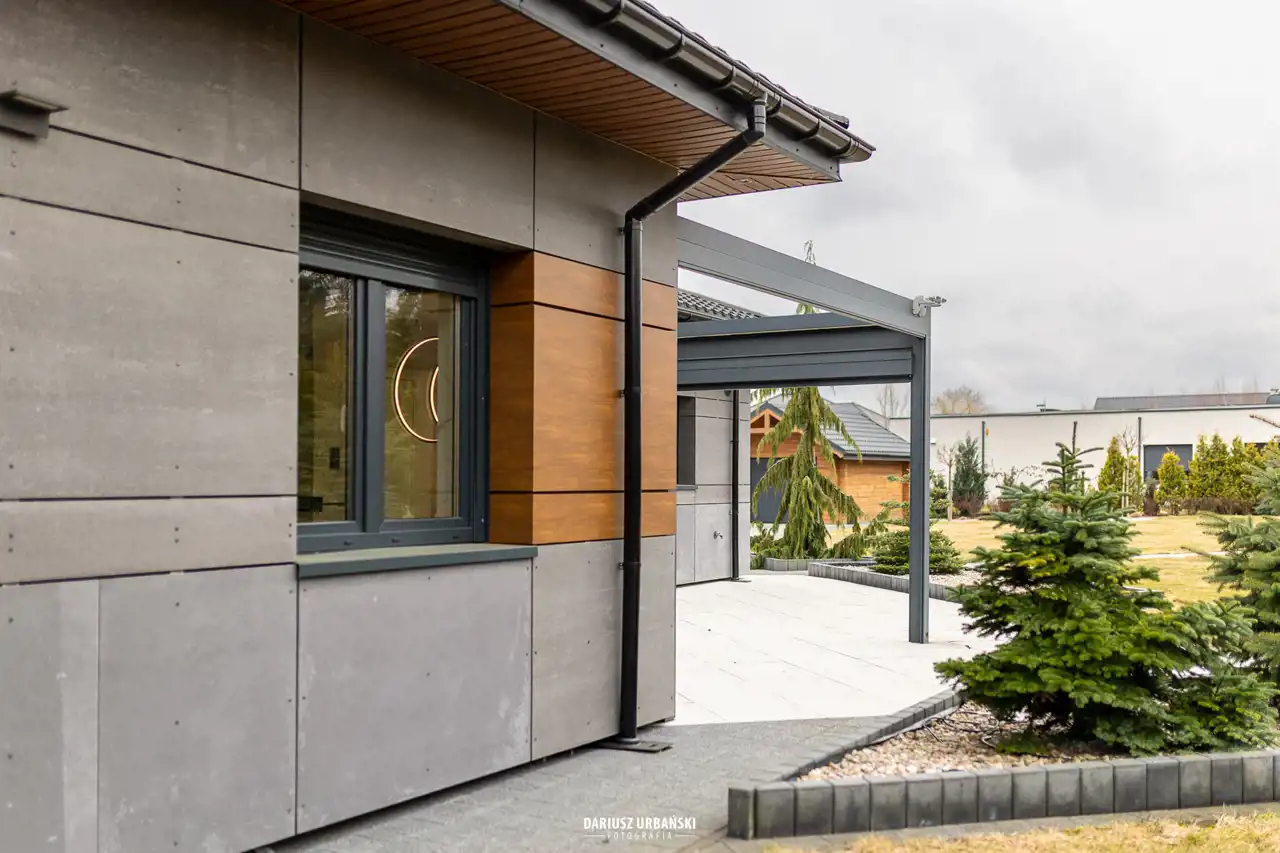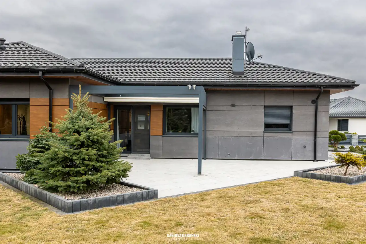 Z głównej części domu wyjście na klimatyczne patio – idealne miejsce na poranną kawę czy wieczorny odpoczynek.