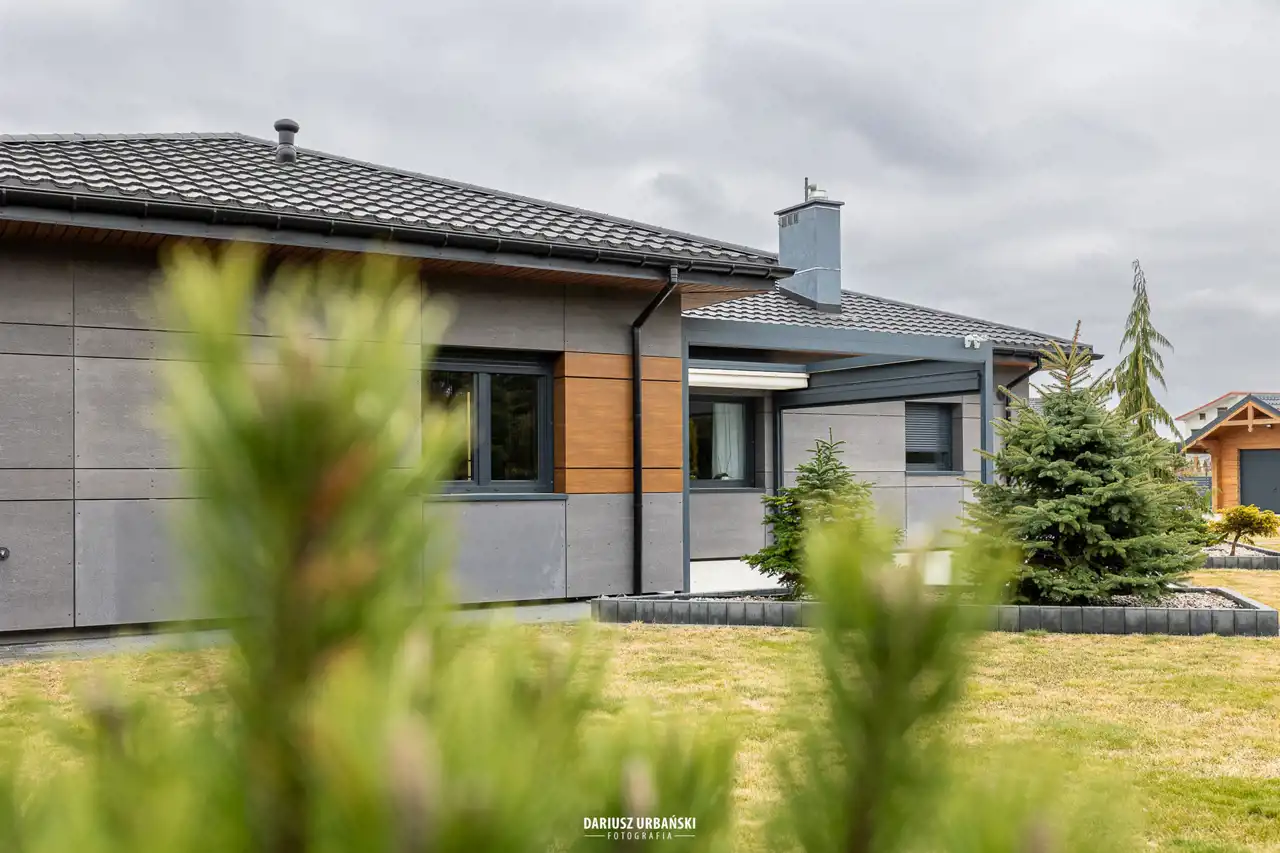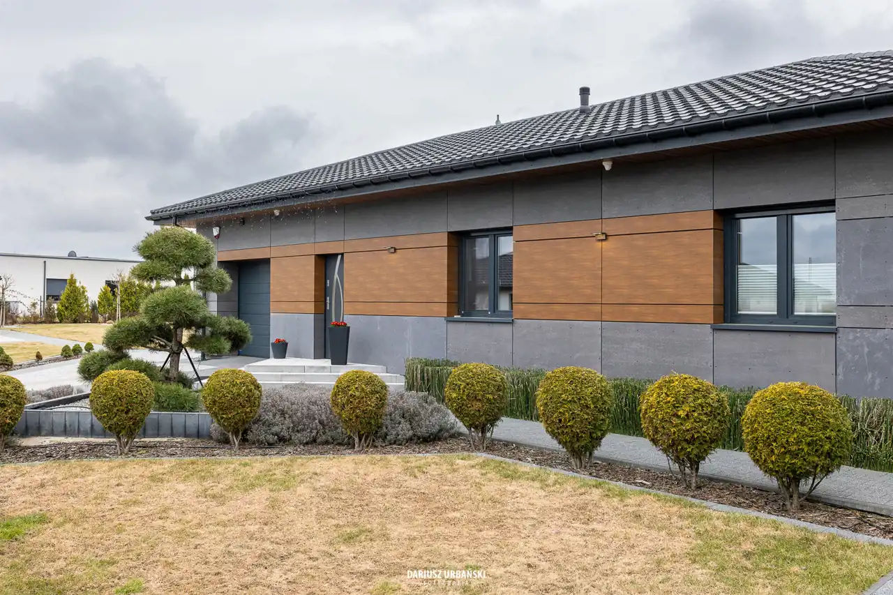 Parterowy bungalow, wolnostojący dom o powierzchni całkowitej 140 mkw z garażem w bryle budynku. Dodatkowy garaż usytuowany na działce z oddzielną bramą wjazdową.