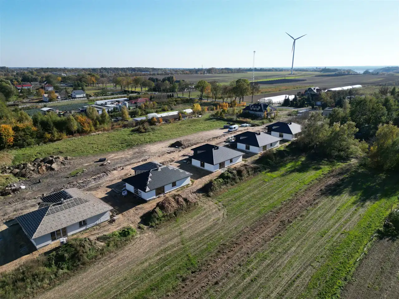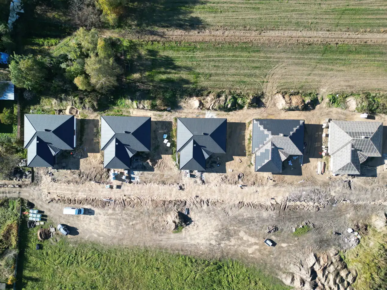 Domy wybudowane z supereksu ocieplone styropianem 20cm. Dach kopertowy pokryty blach dachówką modułową (ocieplenie poddasza: celuloza)