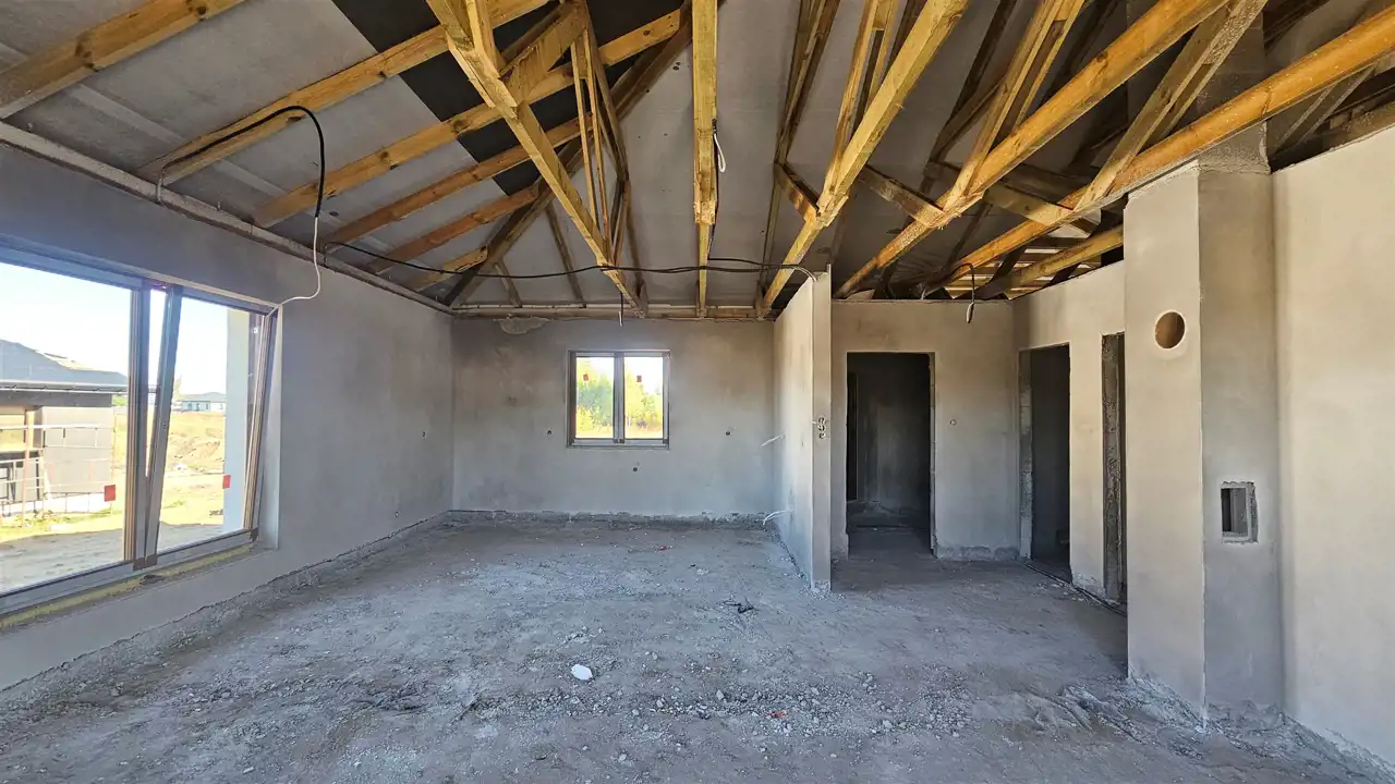 Budynek o bardzo funkcjonalnym układzie. Składa się z przestronnego salonu z jadalnia (ok. 35m2, połączonego z widną kuchnią(ok. 14m2); 3 sypialni (ok. 11; 16 i 13m2), łazienki (ok. 6m2); dodatkowego wc (1,85m2) ; komunikacji; pomieszczenia gospodarczego (ok. 3m2) oraz dużego garażu (ok. 32m2);
