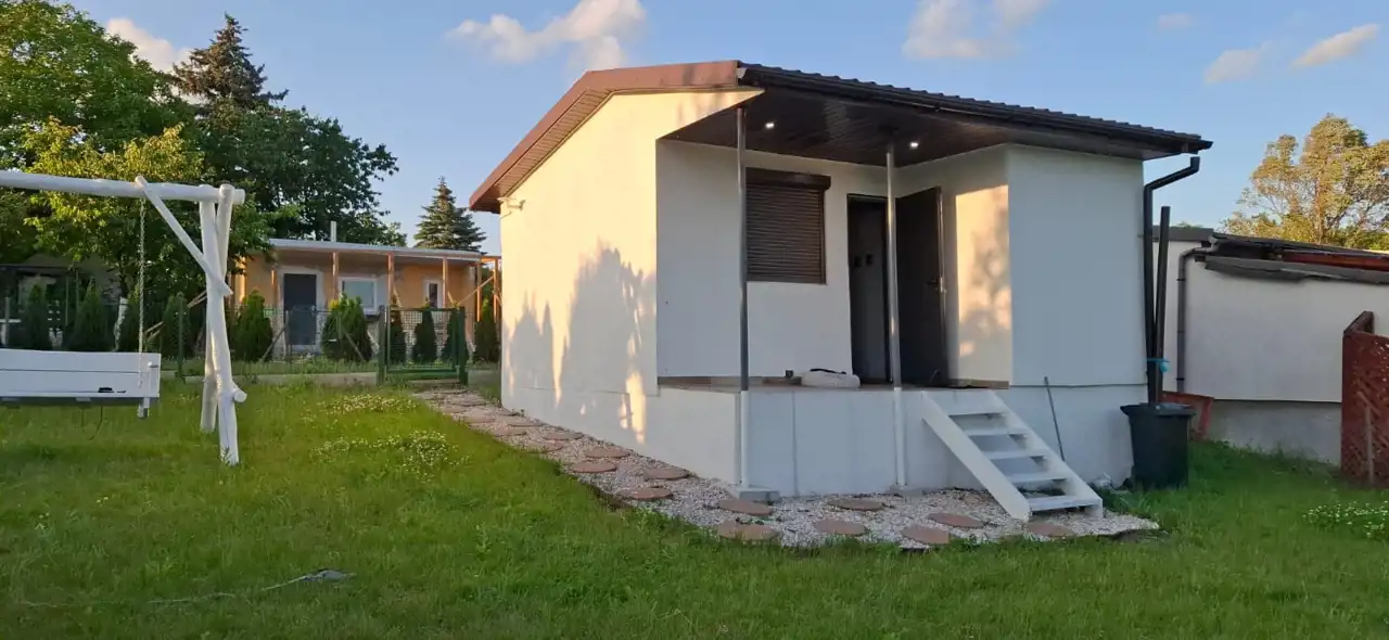 Na działce o powierzchni 320 m2 stoi 30-metrowy domek murowany, składający się pokoju, kuchni i łazienki. Przed domkiem niewielki taras z którego można podziwiać piękną panoramę Wisły. Domek jest w pełni wyposażony, pozostają wszystkie meble widoczne na zdjęciach. Zamontowana klimatyzacja która również ogrzewa pomieszczenie.