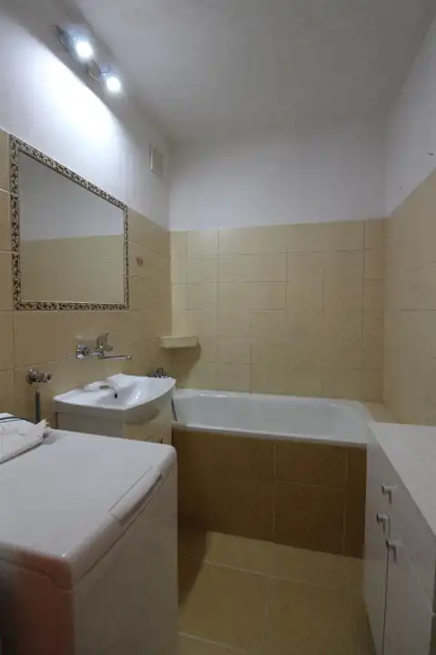 Łazienka z wanną, umywalką, lustrem oraz miejscem na pralkę.