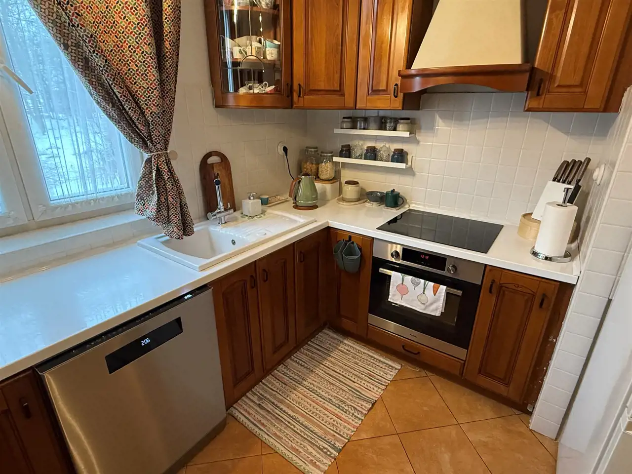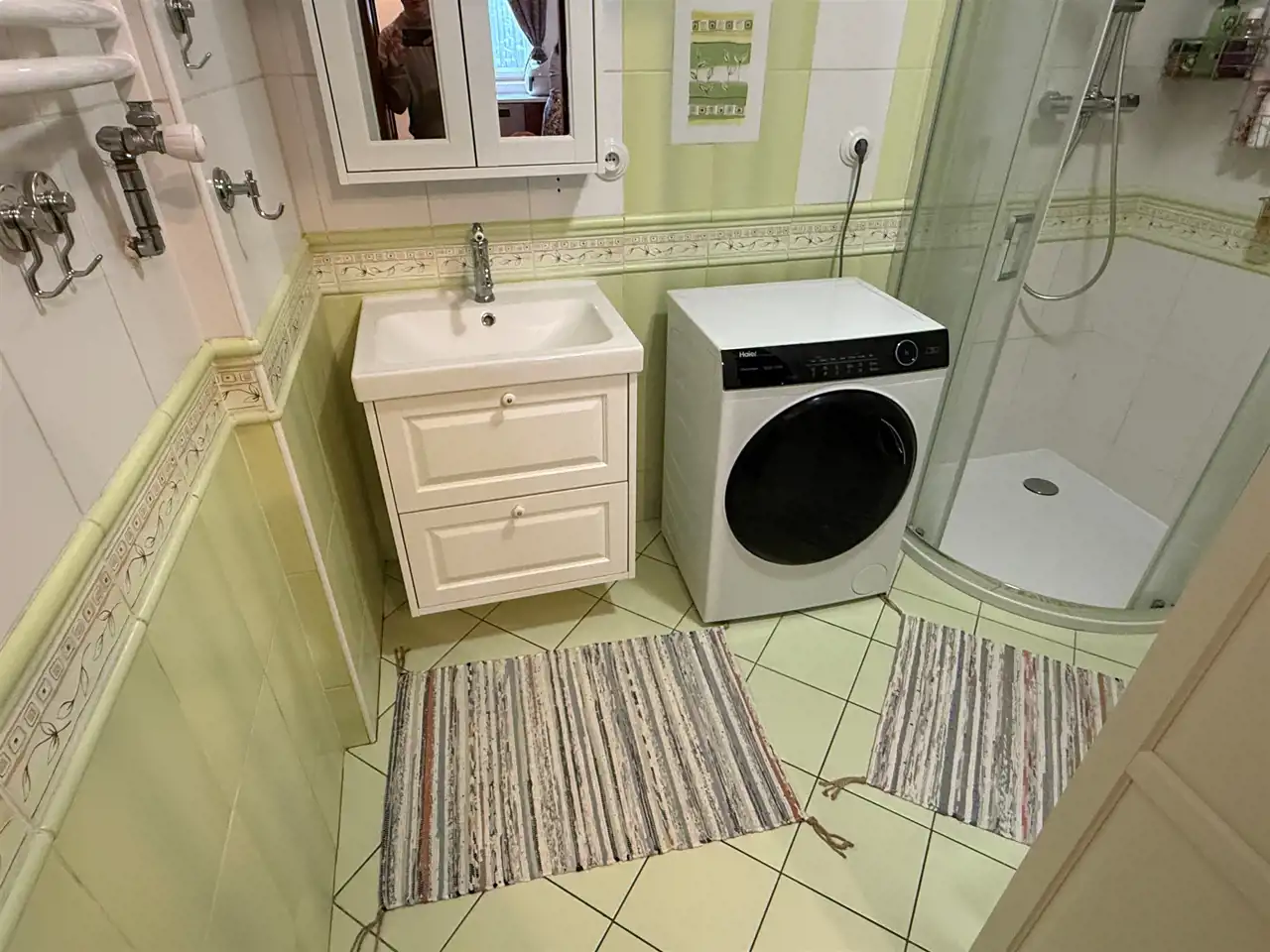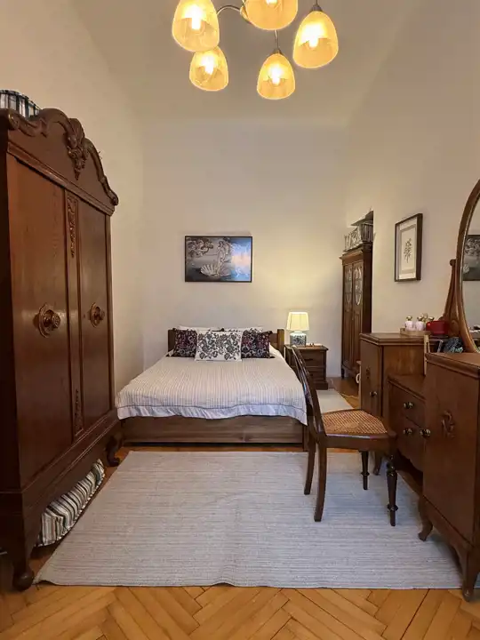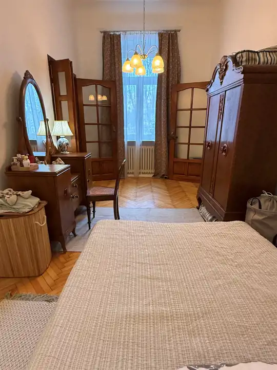 Aranżacja mieszkania cechuje się wysokim poziomem spójności i estetycznej harmonii, styl mieszkania podkreślają: szerokie, stylowe odrestaurowane drzwi między poszczególnymi pomieszczeniami, długie firany i zasłony gobelinowe, nowe żyrandole oraz śliczne porcelanowe włączniki, ciepłe przestrzenne, o wysokości 3,47 m, salon o powierzchni 23,28 mkw, dwa pokoje 15,32 i 14,82 mkw, jasna kuchnia, połączona z hallem 15 mkw, łazienka z WC 4,74 mkw, ganek 2,99 mkw, wykończone w wysokim standardzie: okna PCW, w pokojach na podłodze parkiet, na ścianach i sufitach gładź, w łazience – glazura, terakota, w kuchni również płytki, zabudowa meblowa z nowym sprzętem AGD: płytą elektryczną, piekarnikiem, zmywarką, lodówką – wszystko w idealnym stanie, czyste, zadbane, dodatkowo zainstalowany filtr do wody pitnej. Na życzenie może pozostać umeblowanie. CO z lokalnej kotłowni, ciepła woda zimą z pieca CO, latem z bojlera elektrycznego, odpływ do kanalizacji gminnej.