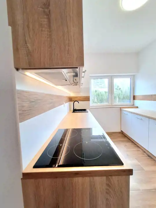 - przestronny salon z aneksem kuchennym o łącznej powierzchni 34m, w której znajdują się meble na wymiar z wysokiej jakości materiałów wraz z nowymi sprzętami AGD