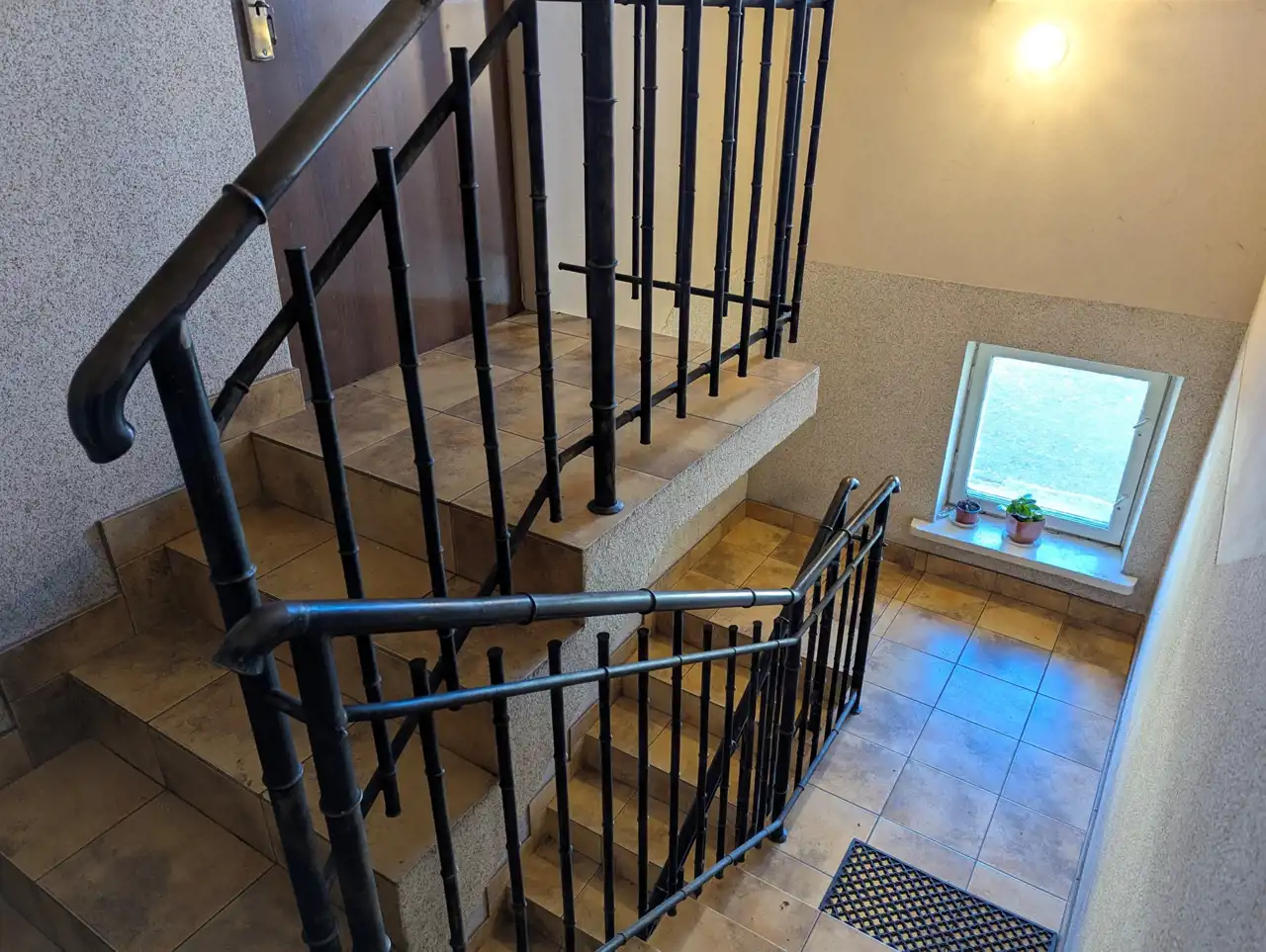 Ładna i czysta klatka schodowa, schody wyłożone gresem, kuta balustrada. Na budynku kamery.