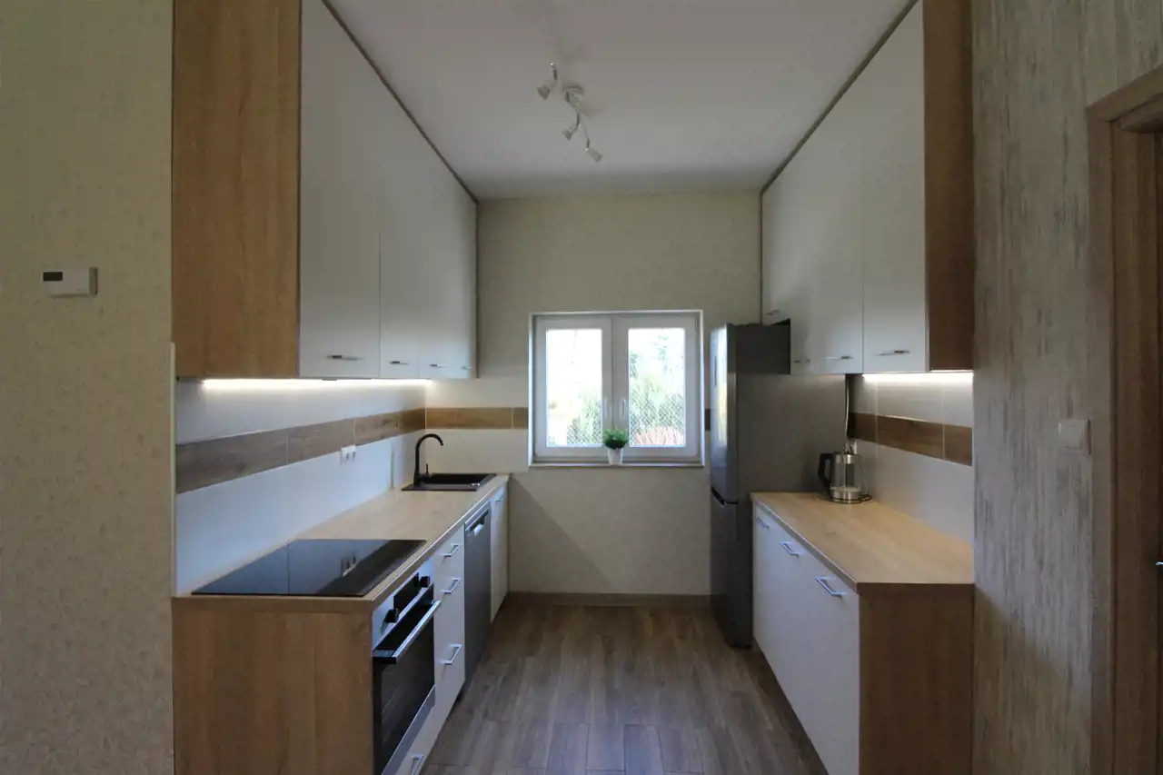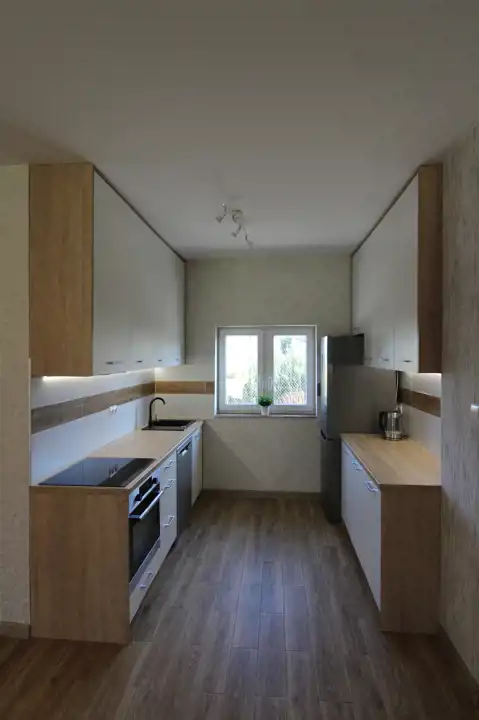 Elegancka kuchnia w nowoczesnej zabudowie z nowym sprzętem AGD.