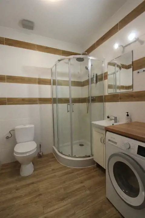 Na wyróżnienie zasługuje także komfortowa łazienka z kabiną prysznicową, zestawem mebli oraz pralką, wykończona glazurą i terakotą o delikatnym designie.