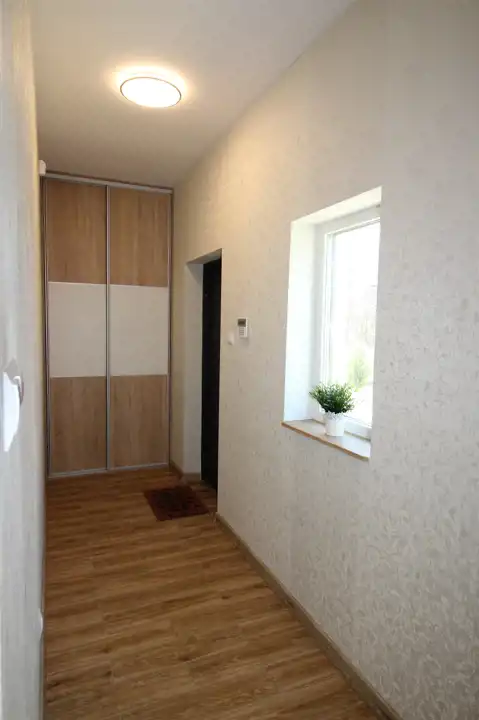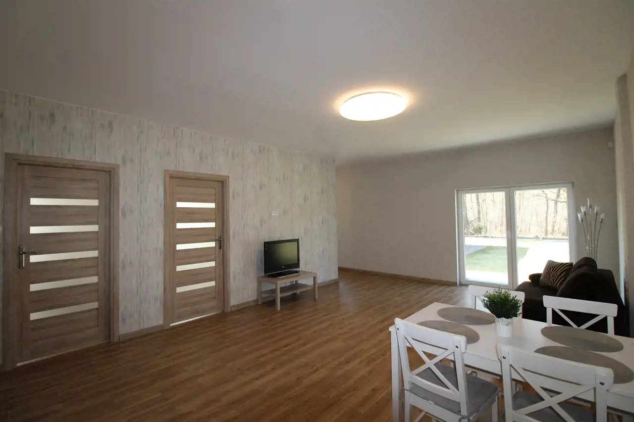 Parterowa o powierzchni 77m kw, składa się z bardzo przestronnego salonu ok.30m kw połączonego z aneksem kuchennym ok.5m kw, dwóch sypialni ok.16m kw i 17m kw, łazienki ok.4m kw z wc, przedpokoju ok.5m kw.